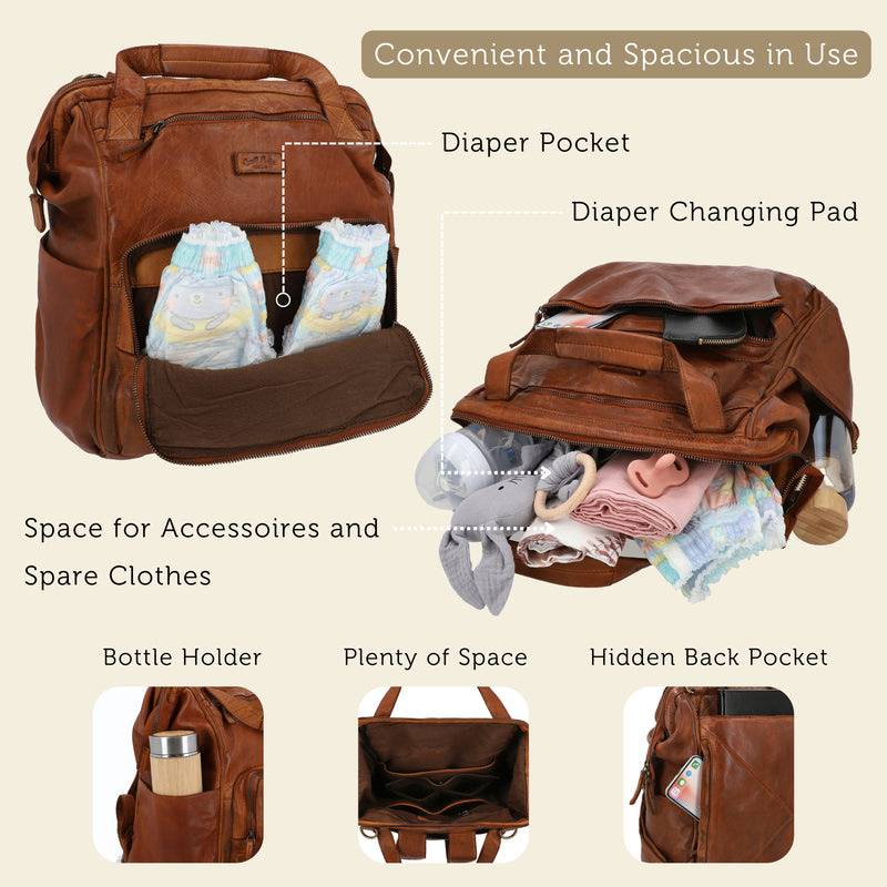 This nappy changing backpack combines style and functionality in one elegant design. The brown leather gives it a classic yet contemporary look and the range of pockets and zips mean that you can store all the things your baby needs easily and safely. There's plenty of space for everything in this bag, from nappies to clothes to bottles. You can adjust the straps so the bag sits comfortably on your shoulder, so you can keep your hands free to take care of your child.