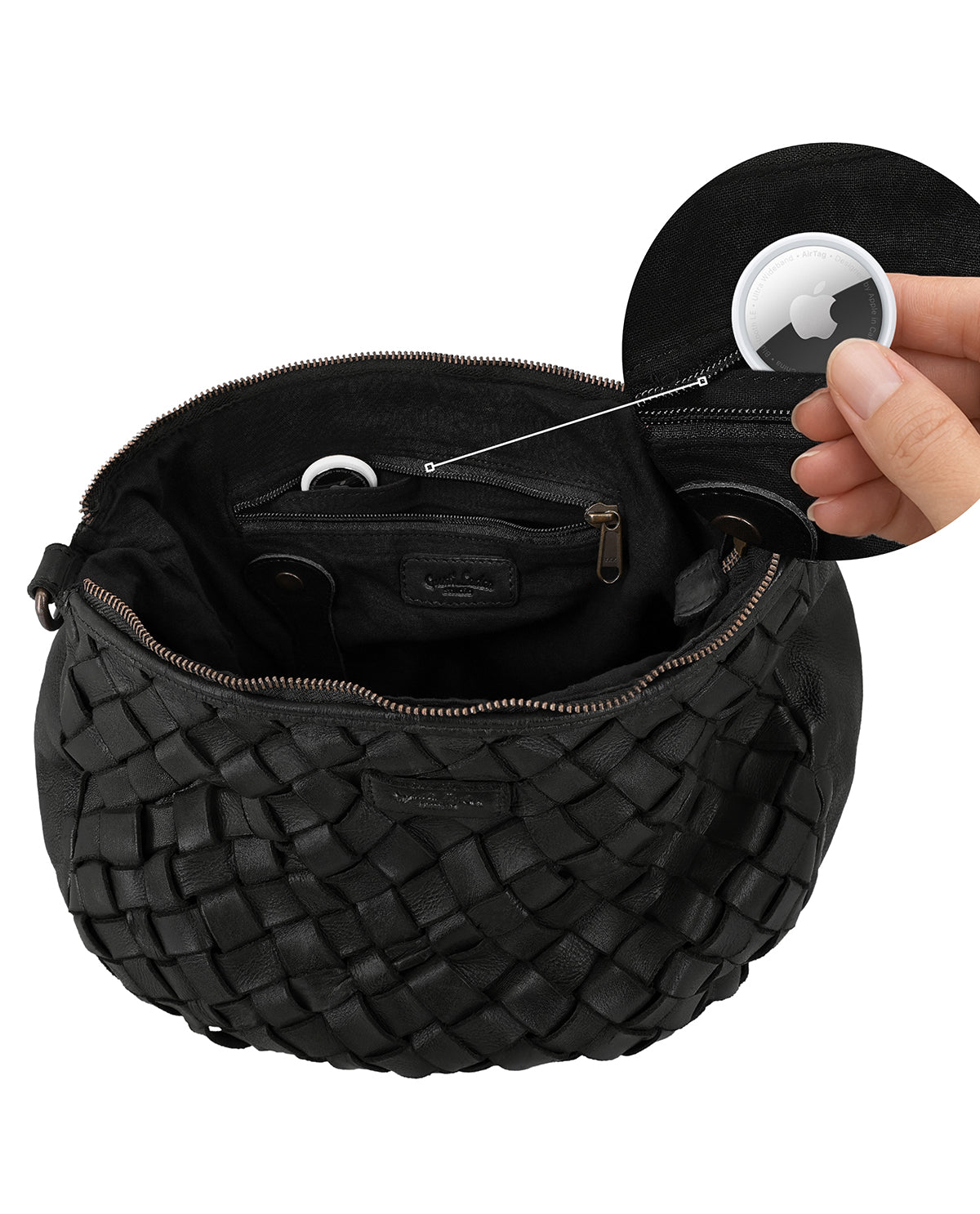 "Clover" immediately catches the eye with its sturdy cowhide leather and coarse woven design. One main compartment has a capacity of 8 liters, which is enough space for small notebooks, keys, wallet, lipstick, and cell phone . A practical key ring holder is integrated so you don't have to search for your keys. For extra security on the go, "Clover" also has a secret AirTag compartment so you can find your bag more easily at any time. The all-around zipper protects your belongings from falling out. Now quickly sling it over your shoulder and off you go. Whether you're heading out into nature or into the hustle and bustle of the city, "Clover" comes with you. The design is rounded off by a Gusti logo patch and an integrated engraving patch that shows off your personalization to its best advantage.