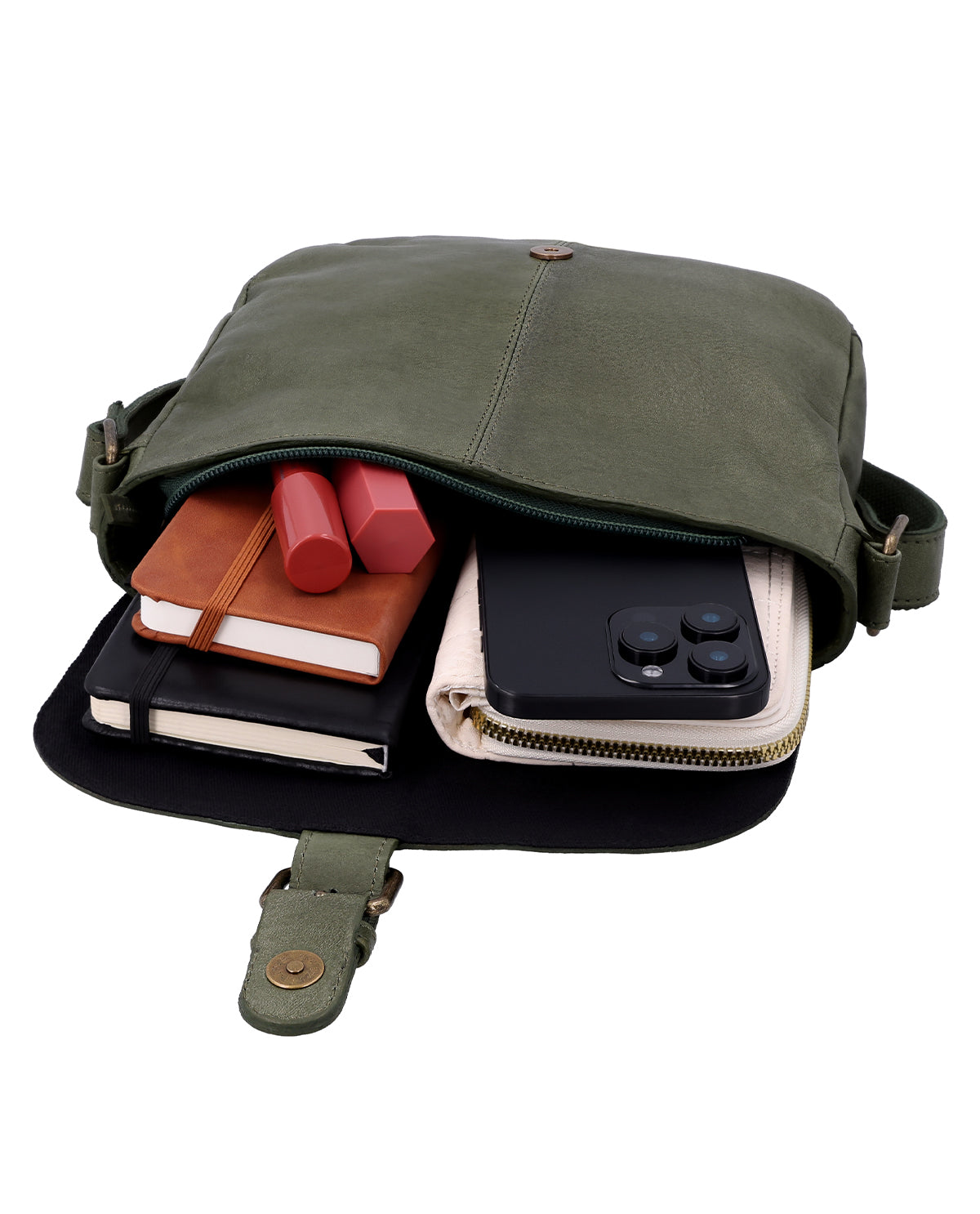 "Candice"impresses with its harmonious design and offers a surprising amount of storage space. In addition to your wallet, smartphone, and keys, it even fits an e-book reader or a classic paperback. The zippered compartment on the back keeps your most important belongings close to your body, while the outer zippered compartment allows quick access to frequently used items. The magnetic closure in a buckle design securely fastens the main compartment. The down-to-earth, chic vintage look makes "Candice" the perfect companion for walks, city trips, and coffee dates. With every use, it proves to be a faithful companion, manufactured under fair, sustainable conditions – for style, function, and conscious action.