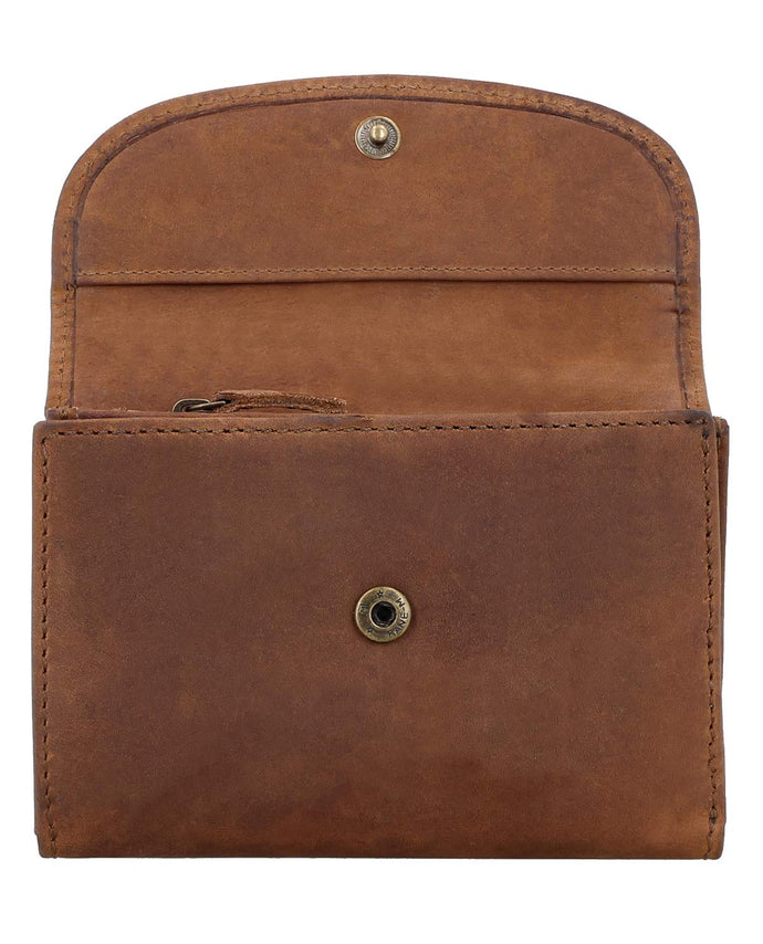 The "Bryanna" wallet, made from high-quality brown leather, combines timeless design with excellent functionality. With its secure snap closure, it ensures that all your valuables are stored safely and securely. The wallet offers numerous card slots, cleverly divided so that you have your cards clearly organized and quickly accessible. Particularly practical are the internal zippered compartments that provide space for coins or other small valuables.