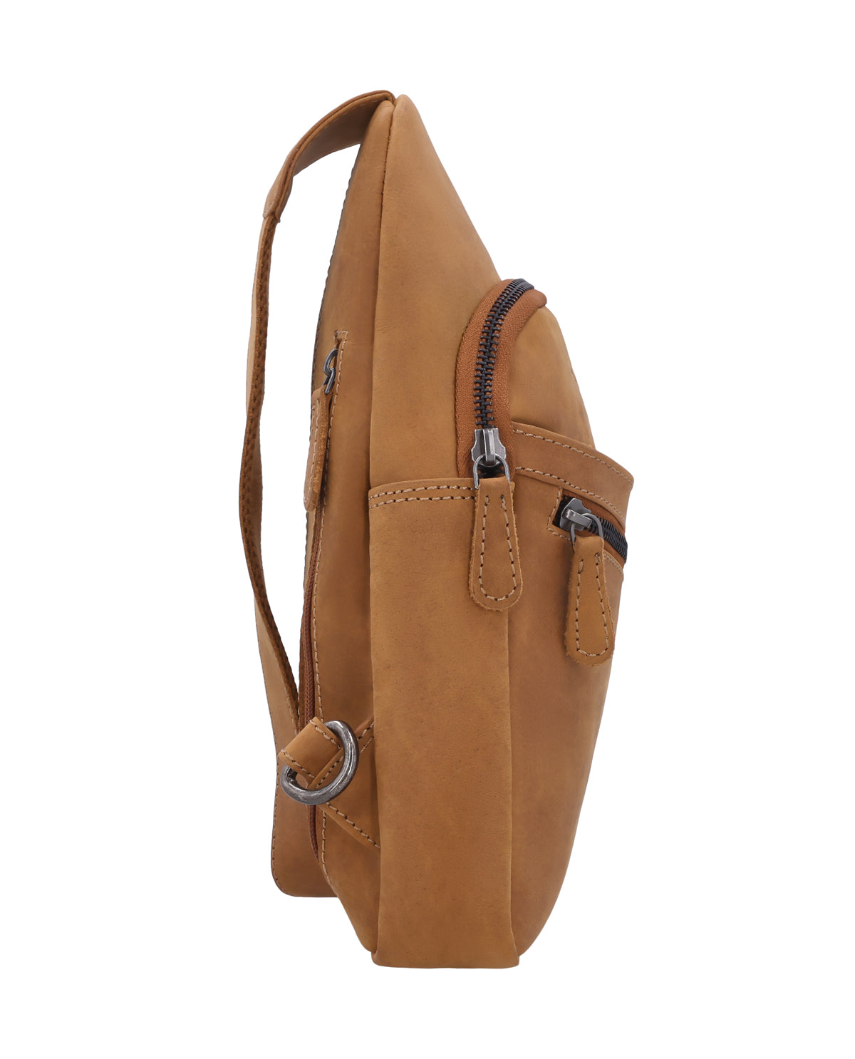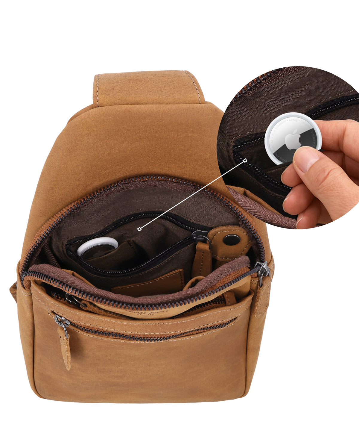 The Azon leather bag is a versatile sling pack for men that easily adapts to your everyday life. A removable key ring keeps your keys securely in place, and a hidden AirTag compartment gives you extra peace of mind when you're on the go. Two zippered compartments on the outside – one at the front and one at the back – ensure that you can store your essentials quickly and securely. There is also another zippered exterior compartment for items that you like to keep separate and handy. Whether worn as a belt bag, across the shoulder, or as a compact shoulder backpack, Azon remains flexible and comfortable, no matter how you travel. The brown leather gives the bag a natural, urban look and makes it a reliable companion for city life, travel, or spontaneous adventures.