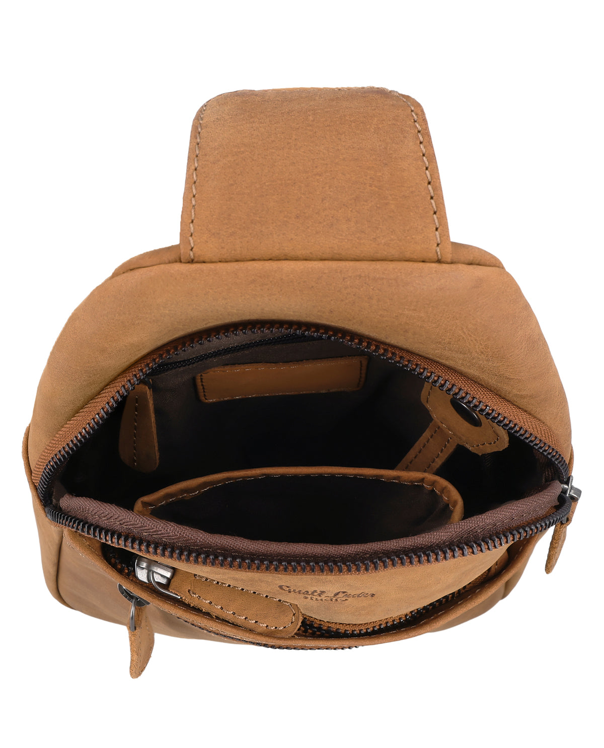 Inside, an inner slip pocket helps you keep small items organized, while a zippered inner compartment reliably protects your valuables. The adjustable and removable carrying strap allows you to choose from a variety of carrying options and adapts flexibly to your needs. Azon closes with a zipper on one main compartment to keep everything securely in place when you're on the go. An engraving patch is also integrated for a personal touch, and the discreet Gusti logo rounds off the look harmoniously. "Azon" is a leather sling bag that skillfully combines functionality and everyday practicality.