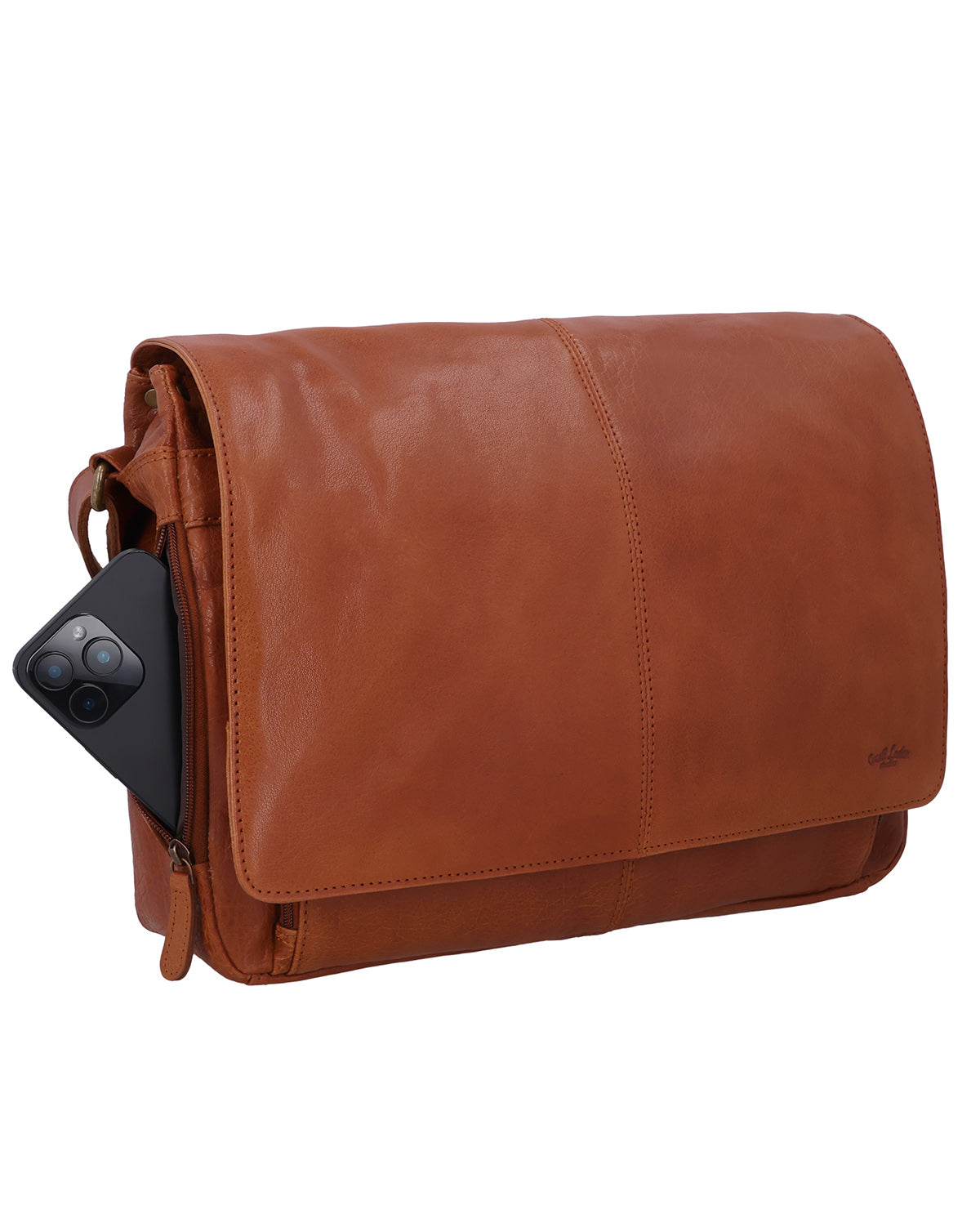 Two outer slip pockets and a large outer compartment with a zipper provide quick access to documents and accessories. Inside this compartment, several concealed zipper pockets, a snap-fastener pocket, a slip pocket, and two pen holders keep everything tidy. A separate laptop compartment reliably protects your device, complemented by a zipper pocket in the main compartment and another pocket on the back of the bag. The shoulder strap is adjustable and adapts to your everyday needs, while the magnetic closure allows for quick opening and secure closing. An engraved patch and the Gusti logo on the inside and outside round off "Florin" as a high-quality leather business bag.