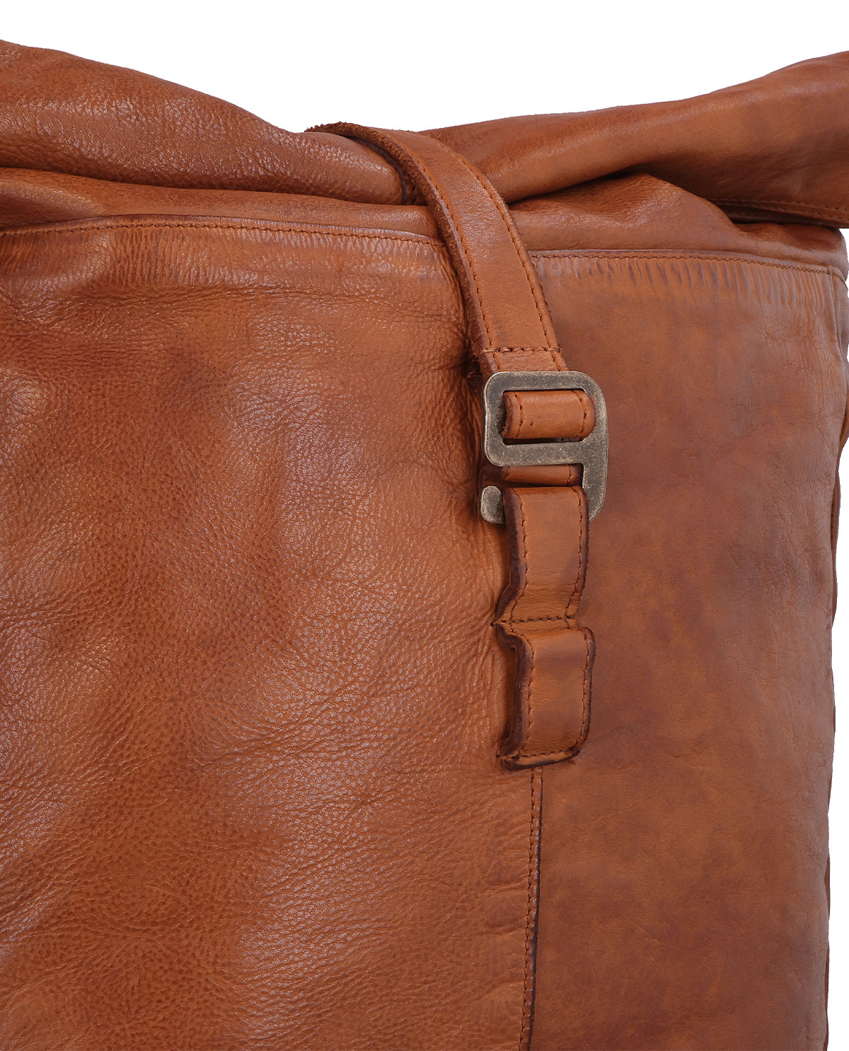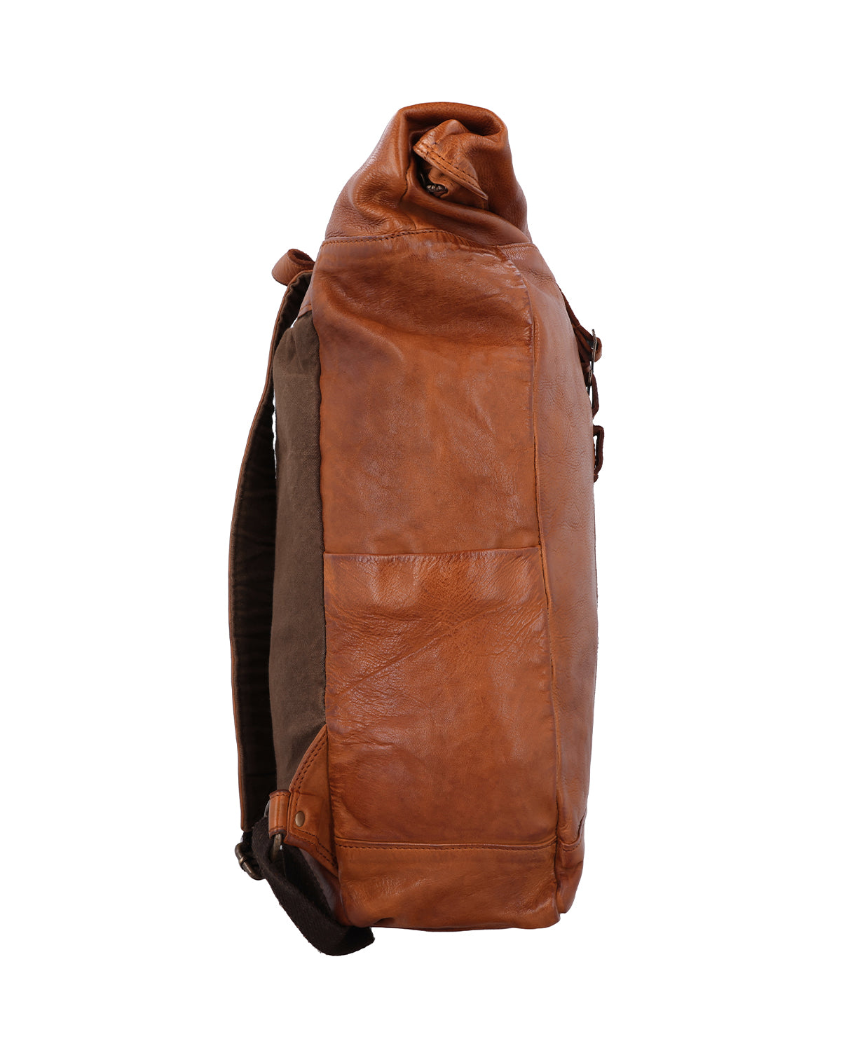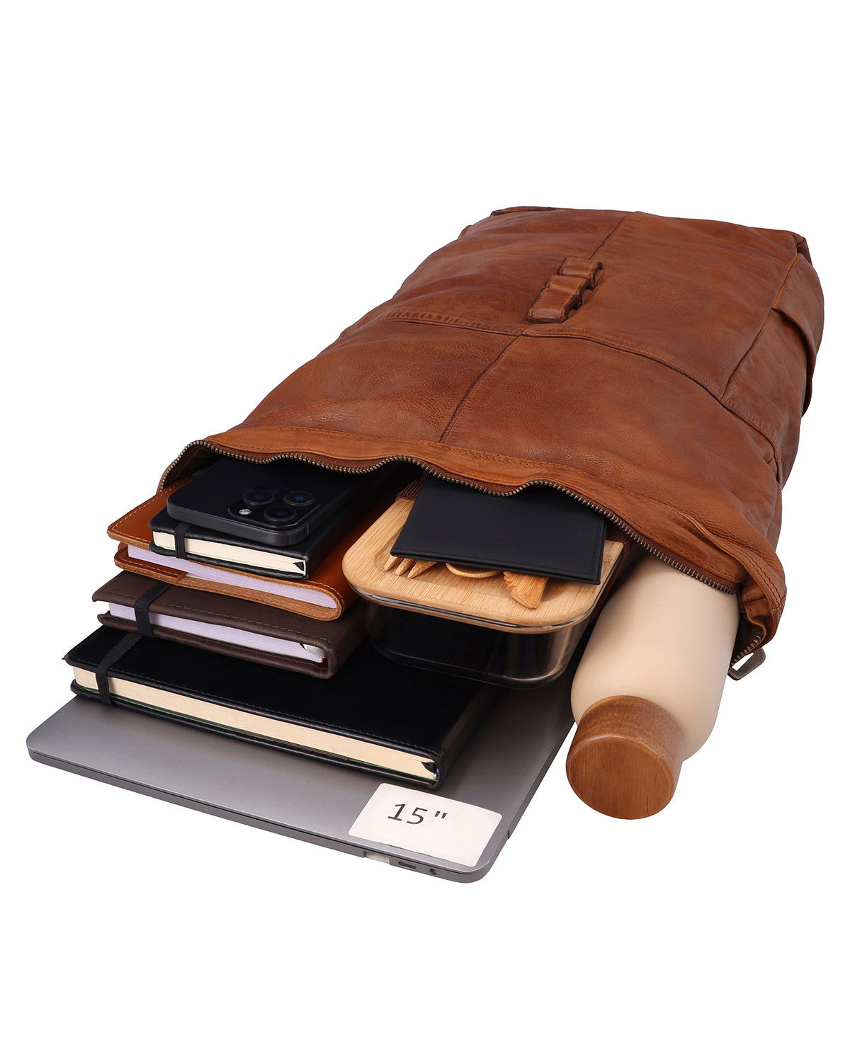 Our “Bendik” rolltop backpack is the perfect companion, no matter if you’re going to school, uni or work. He’ll win you over with his flexibility, comfort, and space. This sturdy, classic daypack made of brown leather stands out from the crowd with its trendy rolltop—a look that you just can’t ignore at the moment.