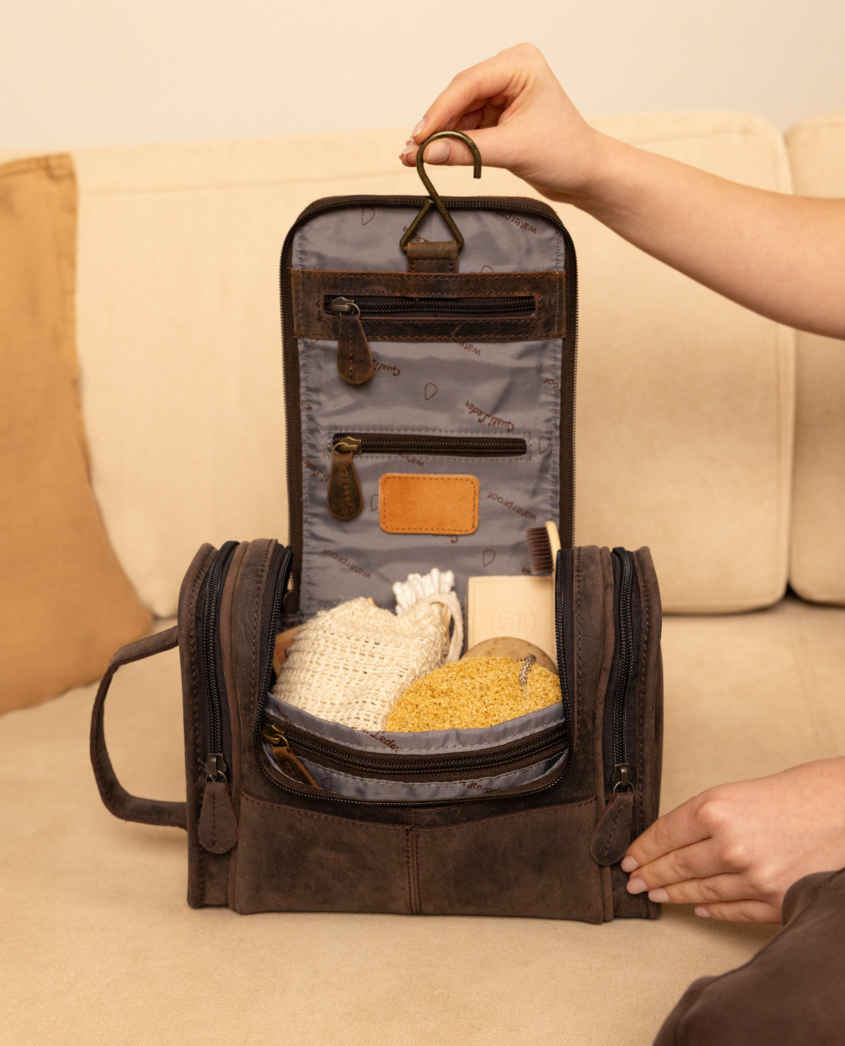 You could play hide-and-seek in this toiletry bag if you were an elf. Super spacious “Chester” has plenty of space for your toiletries. There are multiple pockets inside where you can organise your bathroom essentials. Use the two side pockets for things you need easy access to. Hang “Chester” up using the hanging loop while you’re using him. “Chester’s” lining is water-resistant, so no need to worry about small spillages. We’ve created a Gusti Leather toiletry bag that isn’t just functional, it’s super stylish too. Choose between a stylish brown or elegant black toiletry bag for your next trip away. What more could you want? You’ll never have to compromise in the bathroom again with our spacious toiletry bag “Chester”.