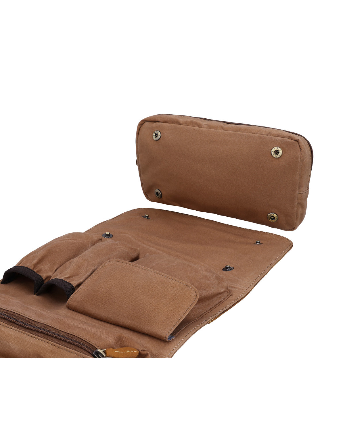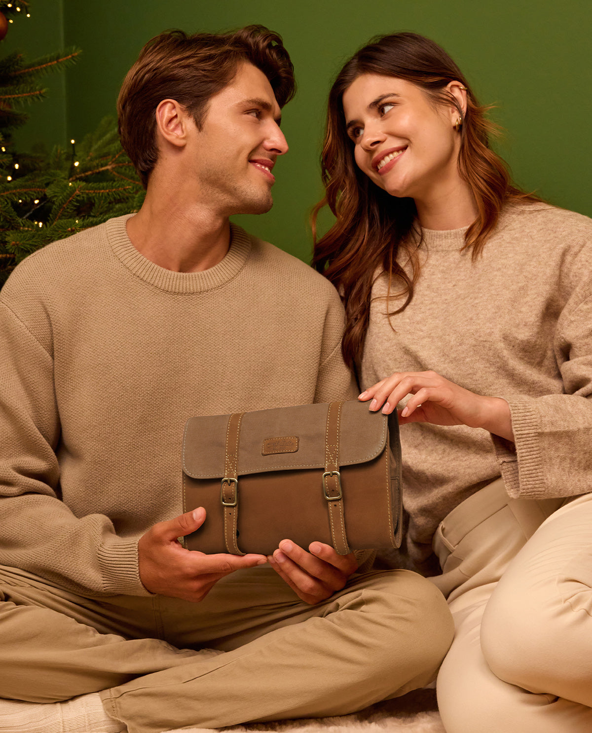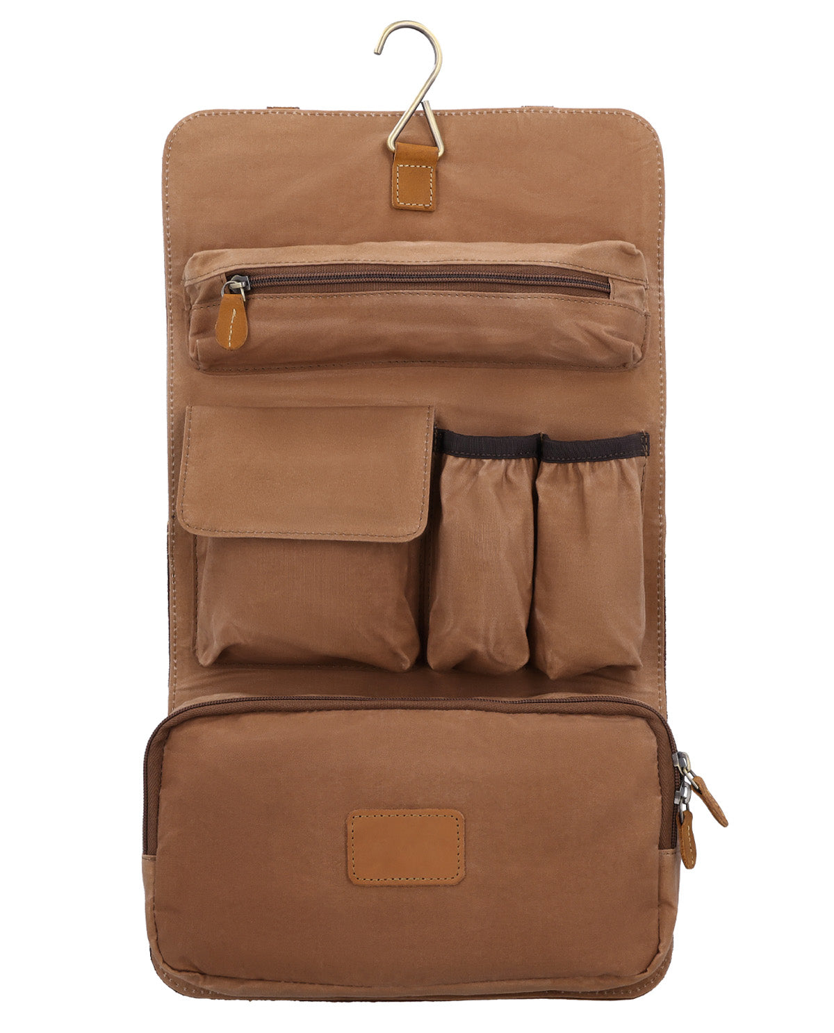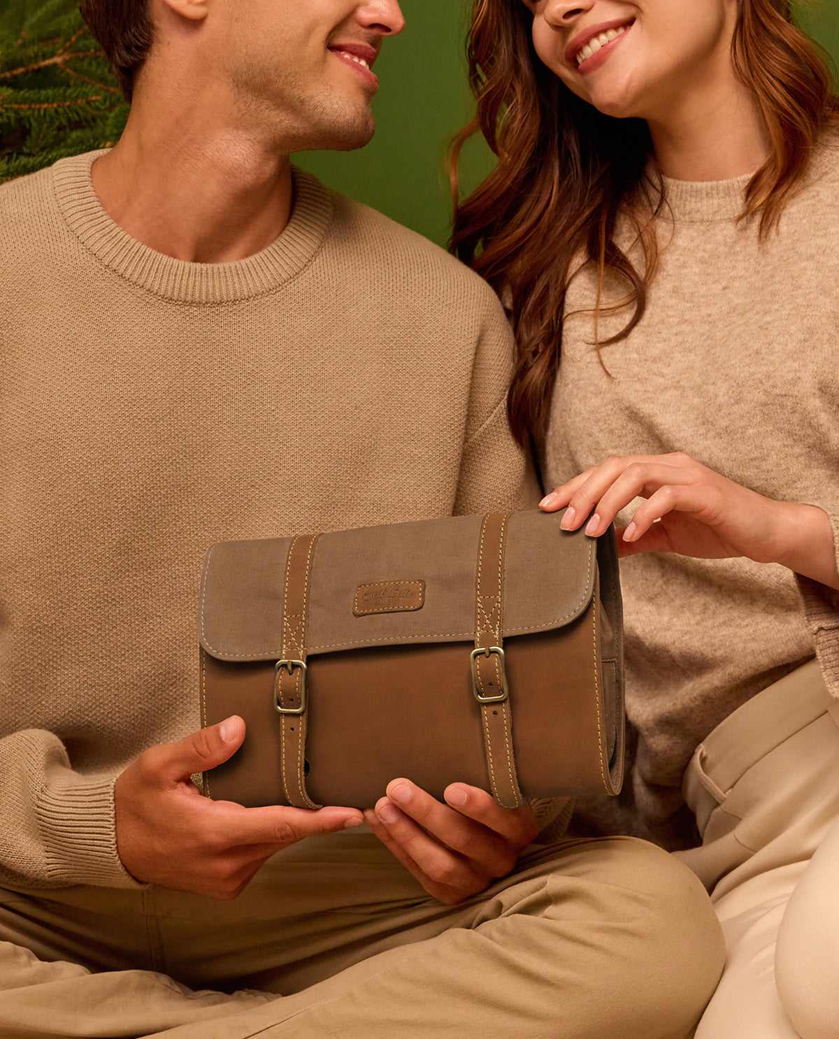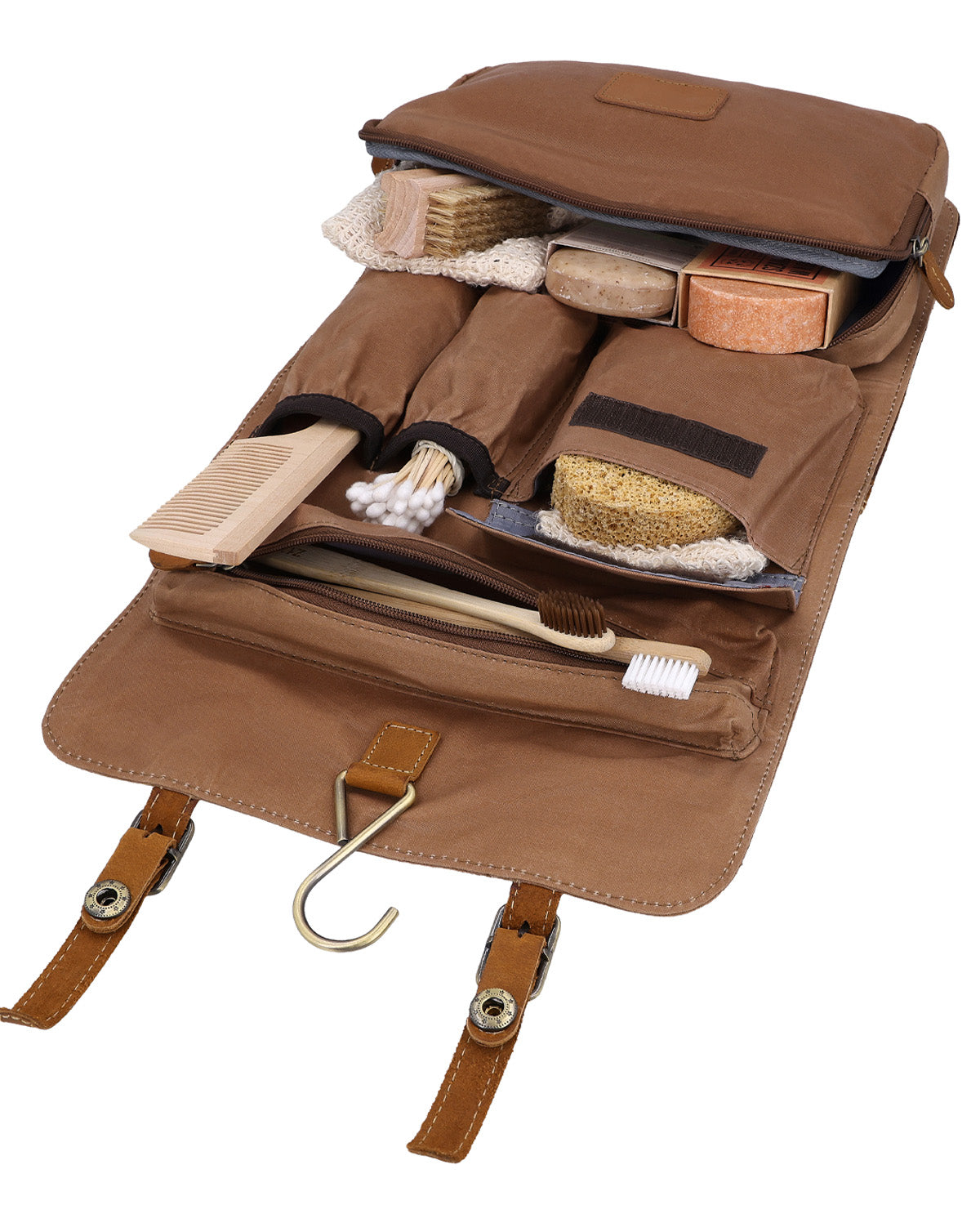 “Rodney's” the gift that just keeps on giving. We've really thought of everything with this toiletry bag. It's made of a mix of high-quality woven canvas and buffalo leather. There are lots of different sized and shaped pockets inside, so there's plenty of space for your toothbrush, shampoo, hairbrush, shaving kit, make-up and more. The water-resistant polycotton lining stops any leakages from getting out of control. “Rodney” comes with a sturdy metal hook, so you can hang him easily on your wall. His design is completed by the adjustable buckles and press buttons. Our toiletry bag “Rodney” is truly carefree!
