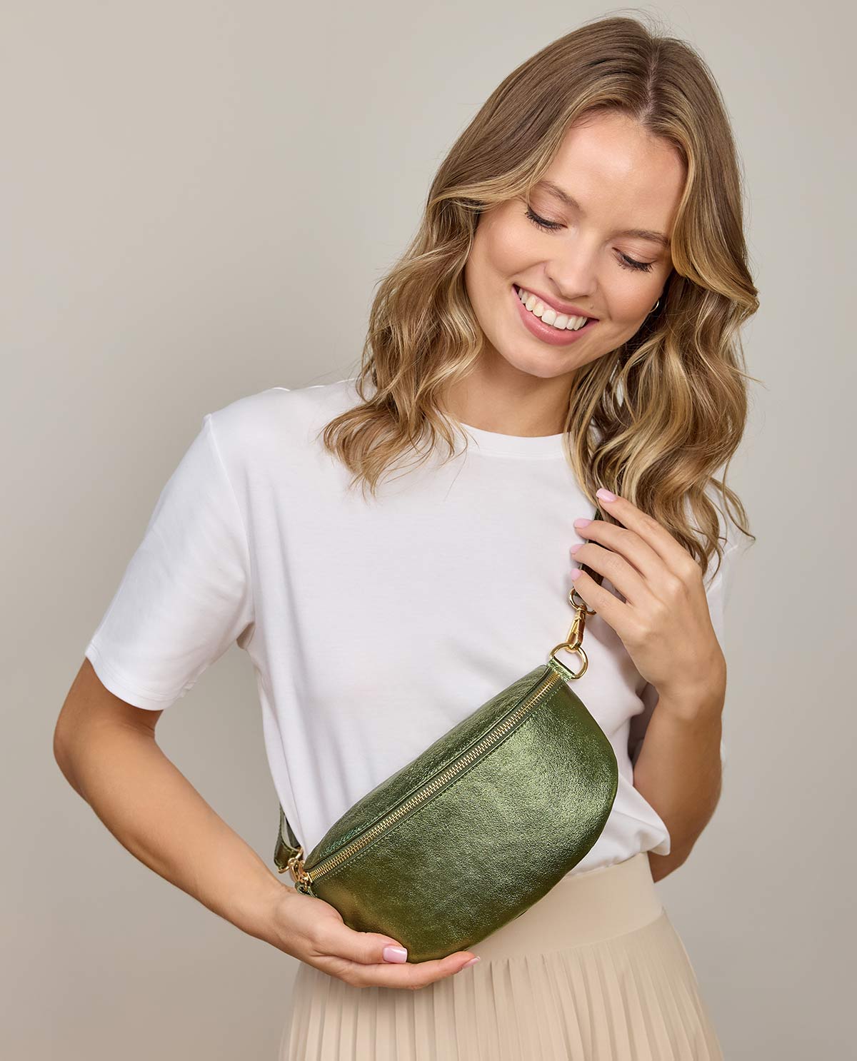 Gürteltasche Bauchtasche Umhängetasche Crossbody Tasche Ledertasche Damen Grün Glänzend Leder - Made in Italy