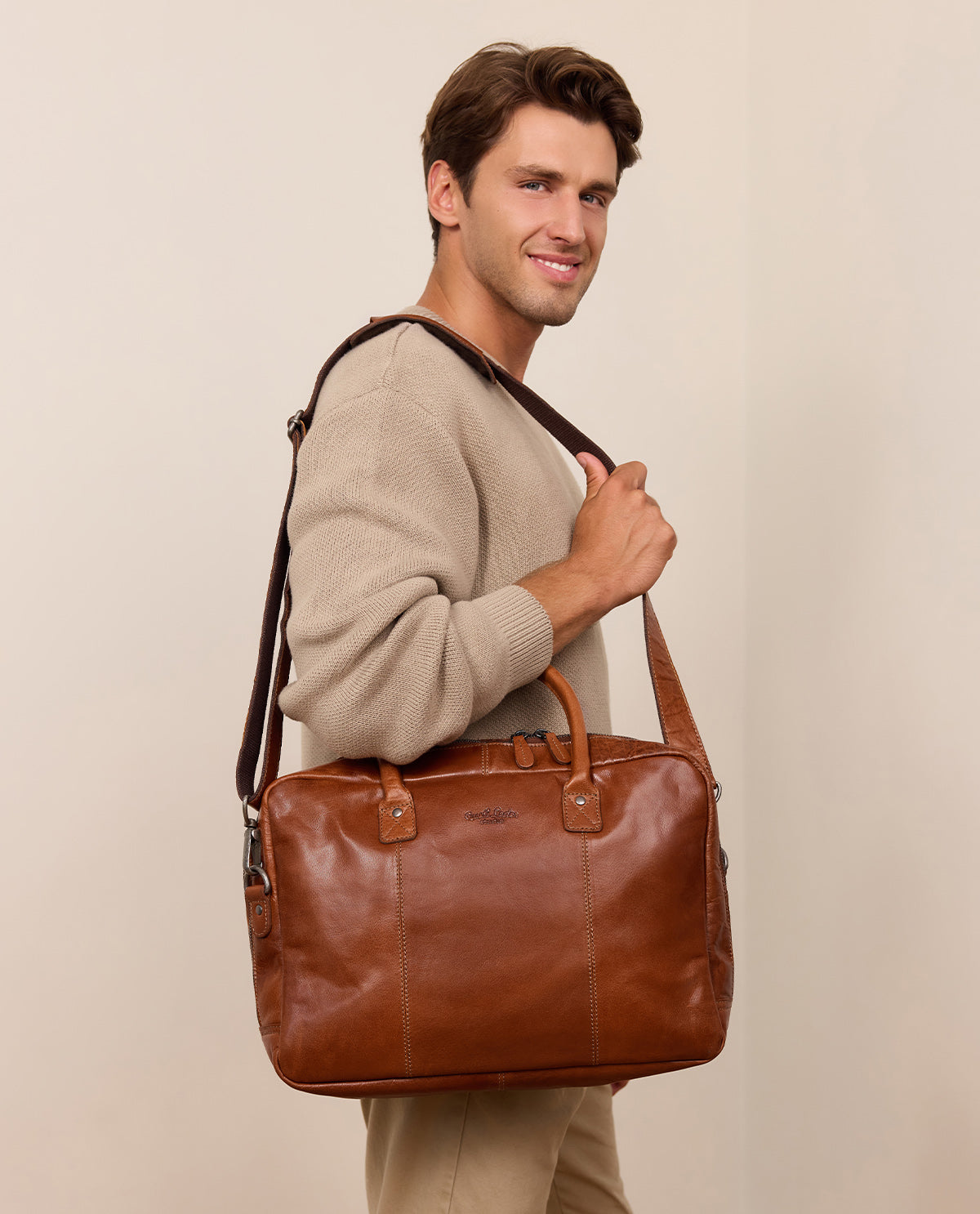 Wir stellen vor: „Fynn“ – dein neuer Lederliebling. Ob Uni, Arbeit oder Alltagstasche: „Fynn“ überzeugt in jeder Lebenslage, denn er hat alles, was Du von einer Aktentasche erwarten kannst. Inspiriert durch Berlin, vereint er urbanen Stil mit außergewöhnlicher Funktionalität. Neben einem Fach für deinen 15" Laptop hat Fynn noch viele weitere Fächer, in denen du Blöcke, Berichte und Bücher unterbringen kannst, ebenso wie diverse Ladegeräte, Notizbuch und Co., Dein Stifteetui, Essentials wie Geldbörse, Smartphone, aber auch Trinkflasche und Schlüssel – einfach alles, was Du auf einer Geschäftsreise bei Dir haben solltest. Dank der weiten Reißverschlüsse kommst Du im Handumdrehen an alle Dinge, die Du gerade benötigst. Und wenn Du die Tasche doch einmal schultern möchtest, ist das auch kein Problem, denn „Fynn“ hat neben den zwei Handhenkeln einen abnehmbaren Trageriemen, den Du individuell auf die für Dich passende Länge einstellen kannst.