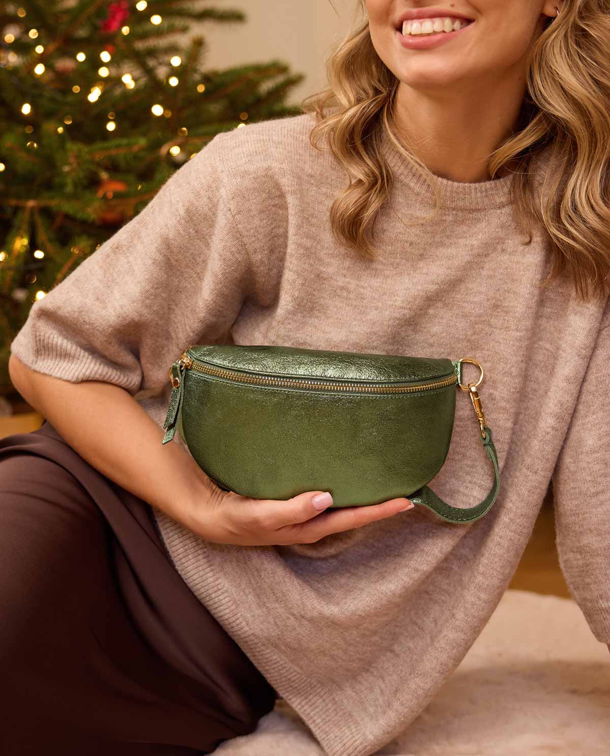 Gürteltasche Bauchtasche Umhängetasche Crossbody Tasche Ledertasche Damen Grün Glänzend Leder - Made in Italy