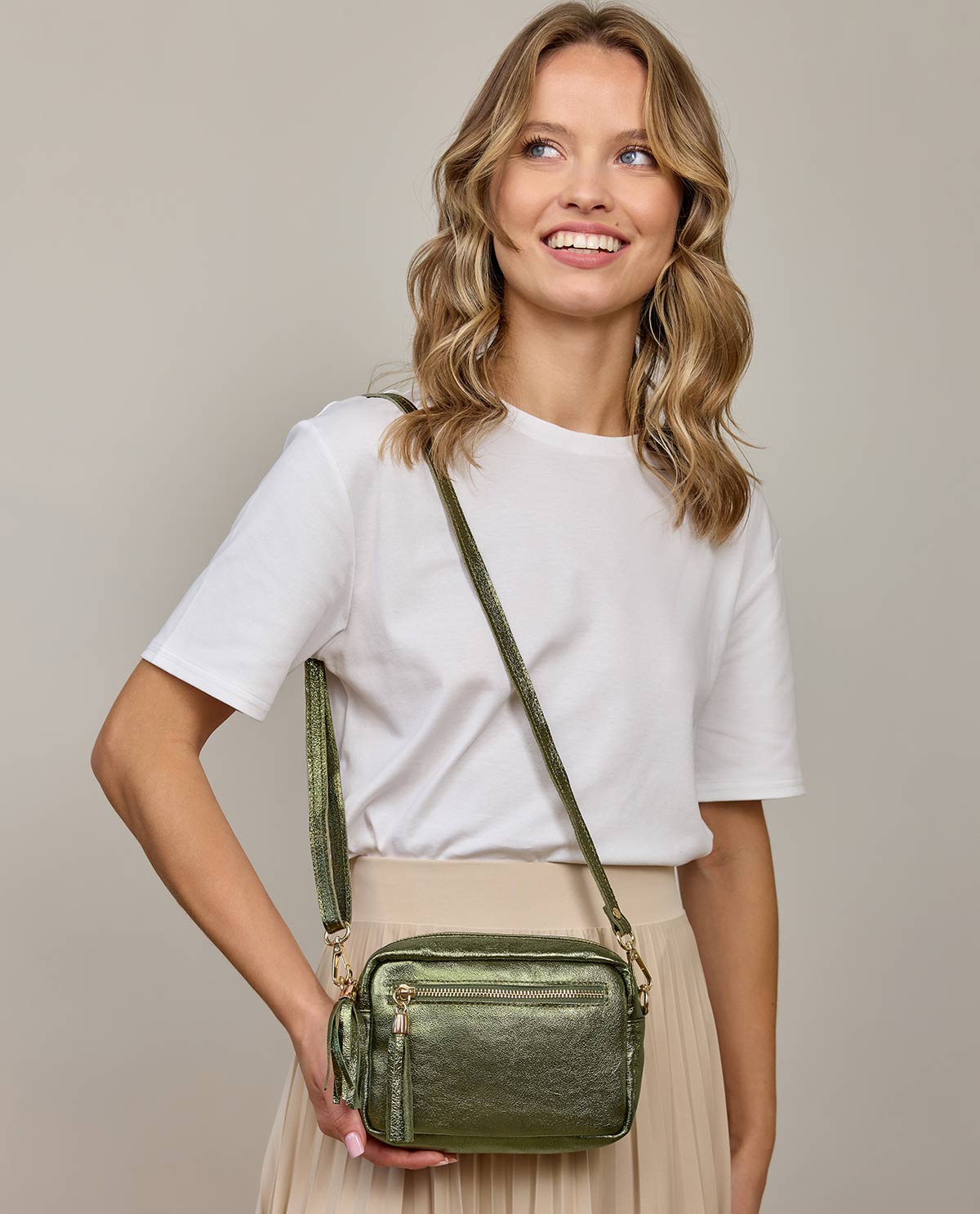 Umhängetasche Ledertasche Handtasche Crossbody Tasche Damen Grün Glänzend Leder - Made in Italy