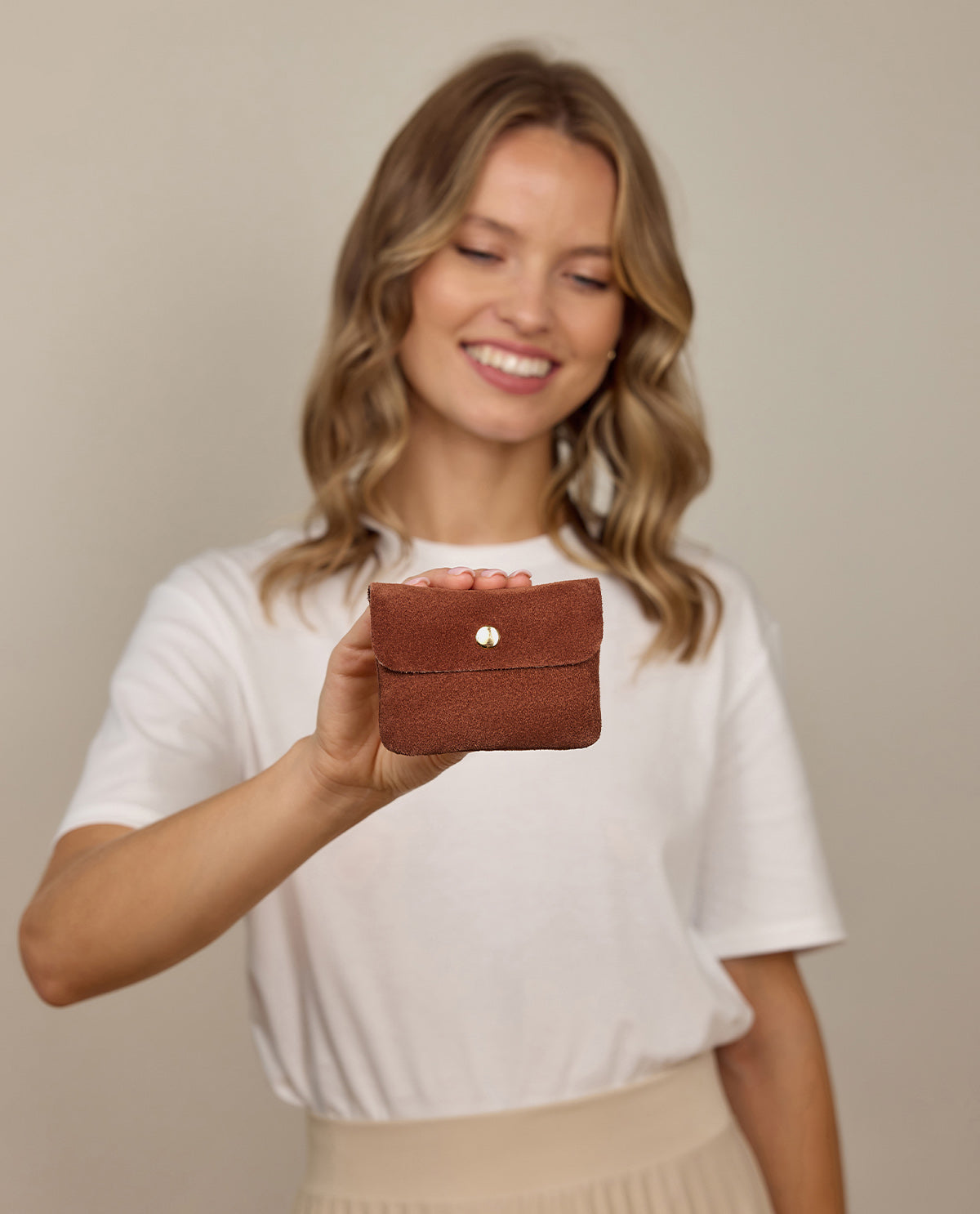 Die "Maite" Aufbewahrungstasche ist die perfekte Lösung, um Deine kleinen, aber wichtigen Utensilien stilvoll zu verstauen. Gefertigt aus hochwertigem Leder mit einer weichen Velours-Optik, bietet sie Dir nicht nur eine edle Optik, sondern auch eine angenehme Haptik. Ihr praktischer Druckknopfverschluss sorgt dafür, dass Deine Dinge sicher verstaut sind, während das Hauptfach mit Reißverschluss zusätzlichen Schutz für Deine Wertsachen bietet. Die kompakte Größe macht es besonders einfach, die "Maite" in einer Tasche oder sogar in der Hosentasche zu verstauen – ideal für den Alltag.