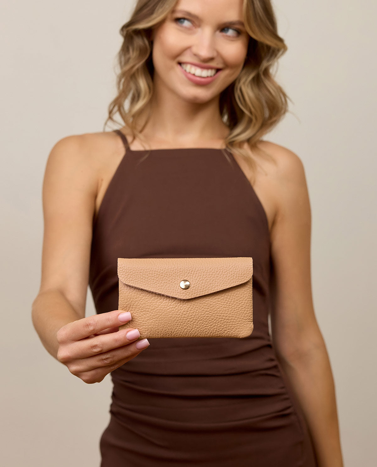 Die "Anela" Aufbewahrungstasche ist mehr als nur ein Accessoire – sie ist die perfekte Kombination aus stilvollem Design und praktischer Funktion. Ihre elegante Umschlagklappe mit magnetischem Verschluss sorgt dafür, dass Deine wichtigsten Utensilien sicher und gleichzeitig schnell zugänglich sind. Aus hochwertigem Leder gefertigt, verkörpert sie die Kunstfertigkeit italienischer Handwerkskunst und besticht durch ihre edle Optik und Haltbarkeit. Zusätzlich kannst Du "Anela" mit einer persönlichen Gravur veredeln lassen – so wird aus einem hochwertigen Accessoire ein ganz besonderes Einzelstück. Diese Tasche fügt sich nahtlos in Deinen Alltag ein und verleiht Deinem Look eine raffinierte Note.