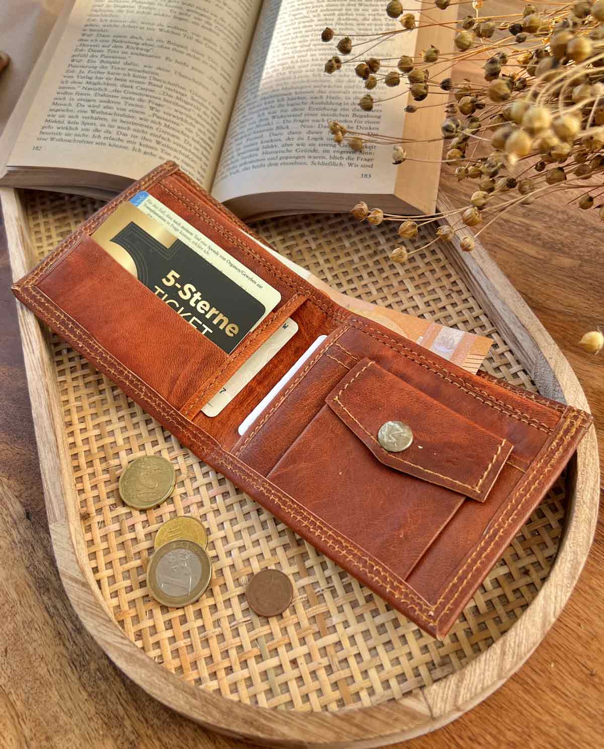 Einfach nur schön! Mit diesem Wort kann man „Joey“ am besten beschreiben. Die Geldbörse verzaubert mit seinem flexiblen und weichen, naturgegerbten Ziegenleder. Schlichtes Vintage-Design trifft auf Natürlichkeit. Ziernähte verleihen dem Design das gewisse Etwas und lassen das Portemonnaie zum Liebhaberstück werden. Mit einer einfachen Klapptechnik lässt sich die Geldbörse schließen. Im Inneren stehen Dir drei Kartenfächer zur Verfügung. Zwei Steckfächer ermöglichen es Dir, weitere Karten sicher unterzubringen. Natürlich ist ebenfalls ein kleines Fach für Dein Kleingeld, abgesichert durch einen Druckknopf, und ein großes, langgestrecktes Fach für Deine Geldscheine vorhanden. Die handliche und praktische Größe lässt es in jede Tasche passen.