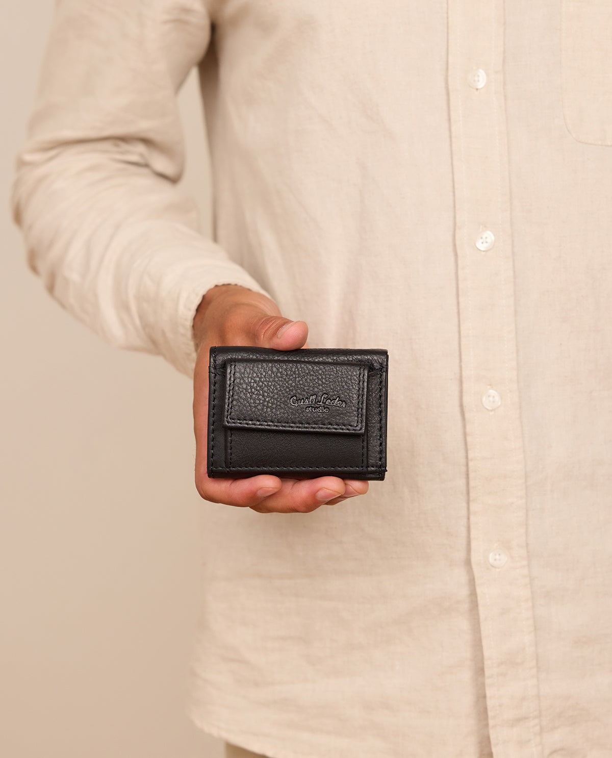 Das "Ronald" Das Portmonnaie aus hochwertigem, schwarzem Leder ist der perfekte Begleiter für Deinen Alltag. Mit seinem eleganten Design und der durchdachten Funktionalität vereint es stilvolle Optik mit praktischer Nutzung. Die edle schwarze Farbe und das feine Leder machen das Portmonnaie nicht nur zu einem funktionalen Accessoire, sondern auch zu einem Statement für Deine persönliche Eleganz.