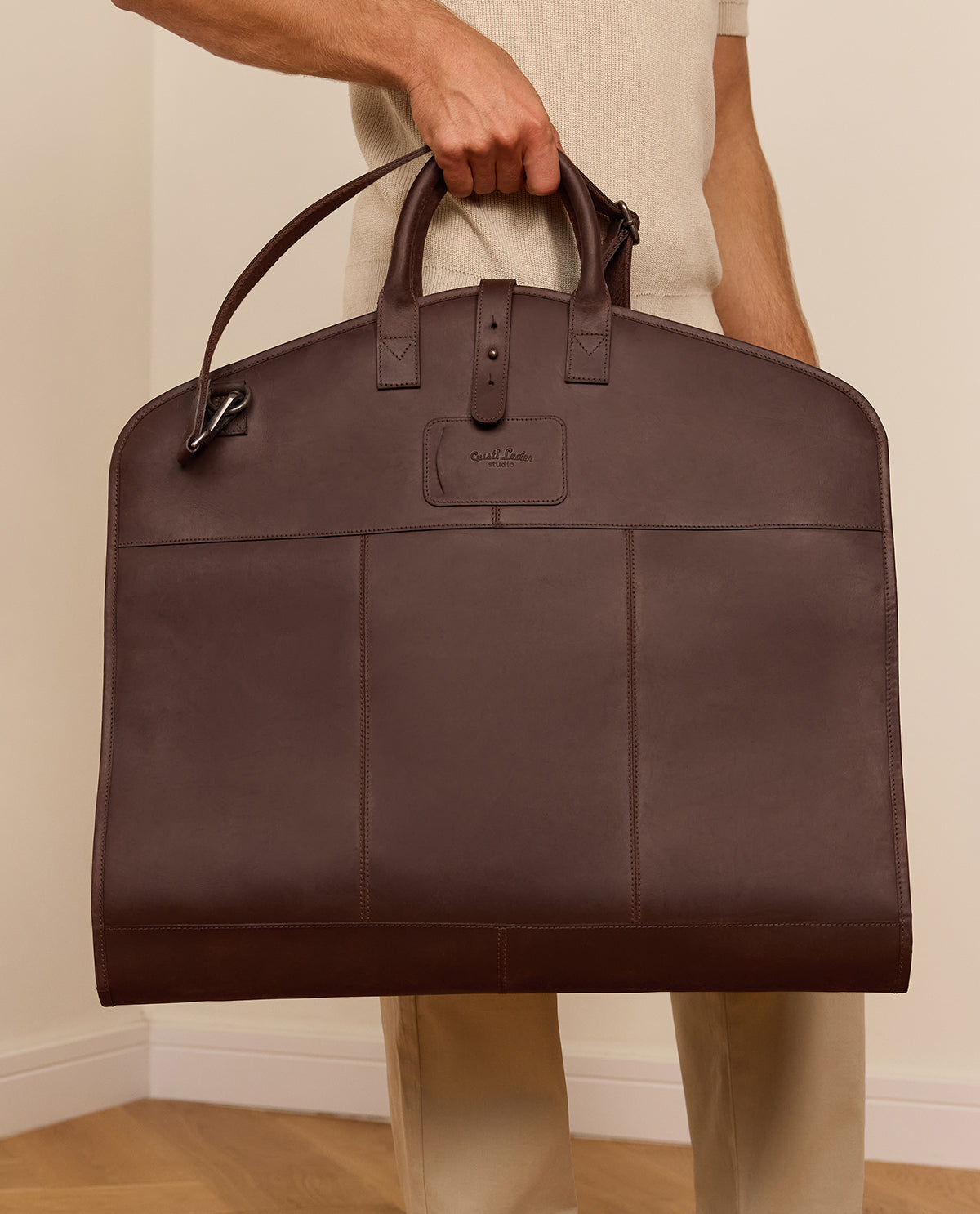 Mit unserer hochwertigen Ledertasche "Sloan" im charmanten Vintagestyle wird jede Reise zum stilvollen Erlebnis. Leichtfüßig, handlich und durchdacht im Design, eignet sie sich perfekt als Begleiter auf Flugreisen oder Geschäftsreisen. "Sloan" bietet ausreichend Platz für mehrere Anzüge oder Kleidungsstücke, die Du bequem auf dem Kleiderbügel hängen lassen kannst. Zwei separate Fächer für Schuhe sorgen dafür, dass Deine Outfits stets sauber und getrennt bleiben. Ein langer Reißverschluss ermöglicht ein komfortables Öffnen und Befüllen der Tasche, während robuste Tragegriffe den Transport besonders angenehm machen. Dank des integrierten Aufhängehakens kannst Du die Tasche direkt im Hotel oder Schrank aufhängen – praktisch und platzsparend zugleich. Das klassische Retrodesign, abgerundet durch das geprägte Gusti Leder Logo, macht "Sloan" zu einem zeitlosen Hingucker. Zusätzlich kannst Du sie mit einer individuellen Gravur personalisieren – für eine Extraportion Individualität.