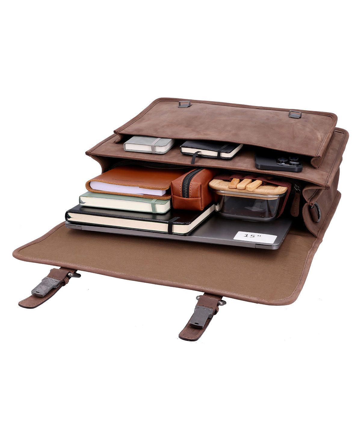 So bietet "Elmar" und sein großzügiges, mittig geteiltes Hauptfach ohne Probleme Platz für DIN A4-Aktenordner und Dokumentenmappen jeglicher Art ebenso wie der Terminkalender, Schreibutensilien, das Lunch-Paket, eine kleine Trinkflasche u.v.m. Technische Geräte bis zu einer Größe von 15" finden unterdessen Platz in einem eigens ins Taschendesign integrierten Laptopfach. Auch das mittig eingefügte Reißverschlussfach sowie die diversen Steckfächer und das aufgesetzte Fach an der Vorderseite von "Elmar" bieten zudem die Möglichkeit, kleinere Habseligkeiten griffbereit zu verstauen, ohne lang nach ihnen suchen zu müssen. Der längenverstellbare und abnehmbare Schulterriemen ermöglicht es Dir dabei, "Elmar" ideal an Deine individuellen Tragegewohnheiten anzupassen, während zwei Schnappverschlüsse in Dornschnallen-Optik dafür sorgen, dass unterwegs alles vor Staub und Feuchtigkeit geschützt ist.