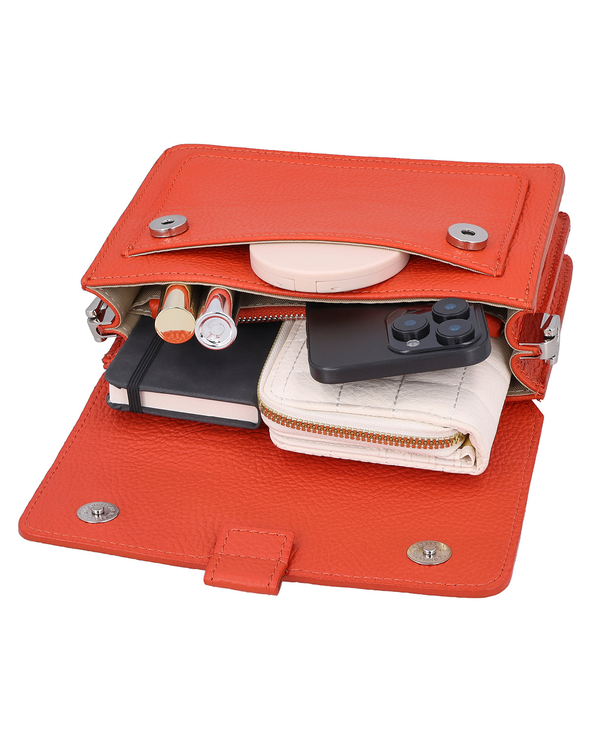 Die Umhängetasche "Trude" vereint zeitlose Eleganz mit durchdachter Funktionalität und begleitet Dich zuverlässig durch Deinen Alltag. Gefertigt aus hochwertigem Leder und veredelt mit einem dezenten Made in Italy Logo, steht sie für Qualität und Stilbewusstsein. Die klare Silhouette mit magnetischer Überschlagklappe verleiht der Tasche eine ruhige, elegante Ausstrahlung. Dank des verstellbaren und abnehmbaren Ledertrageriemens kannst Du "Trude" flexibel über der Schulter oder crossbody tragen – ganz so, wie es zu Deinem Tag passt.