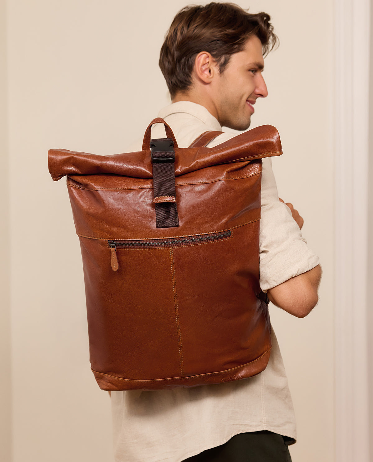 Our “Mattis” roll top backpack is the perfect companion, no matter if you’re going to school, uni or work. He’ll win you over with his versatility, comfort, and space. This sturdy classic dark brown buffalo leather daypack stands out from the crowd with its trendy roll top - a look that you just can’t ignore at the moment.