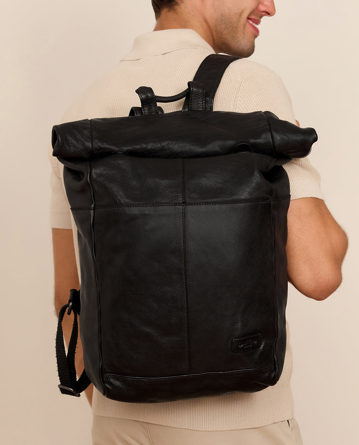 No matter if you take her to the office, college, or use her in your free time, our beautiful messenger bag “Joy” will win you over in no time at all. This backpack will charm you with its versatility, comfort, and spaciousness as well as its discreet and elegant design. In addition to this, the slim-cut day pack made of black cowhide leather stands out from the crowd with its trendy roll top—a look that you just can't get away from at the moment.