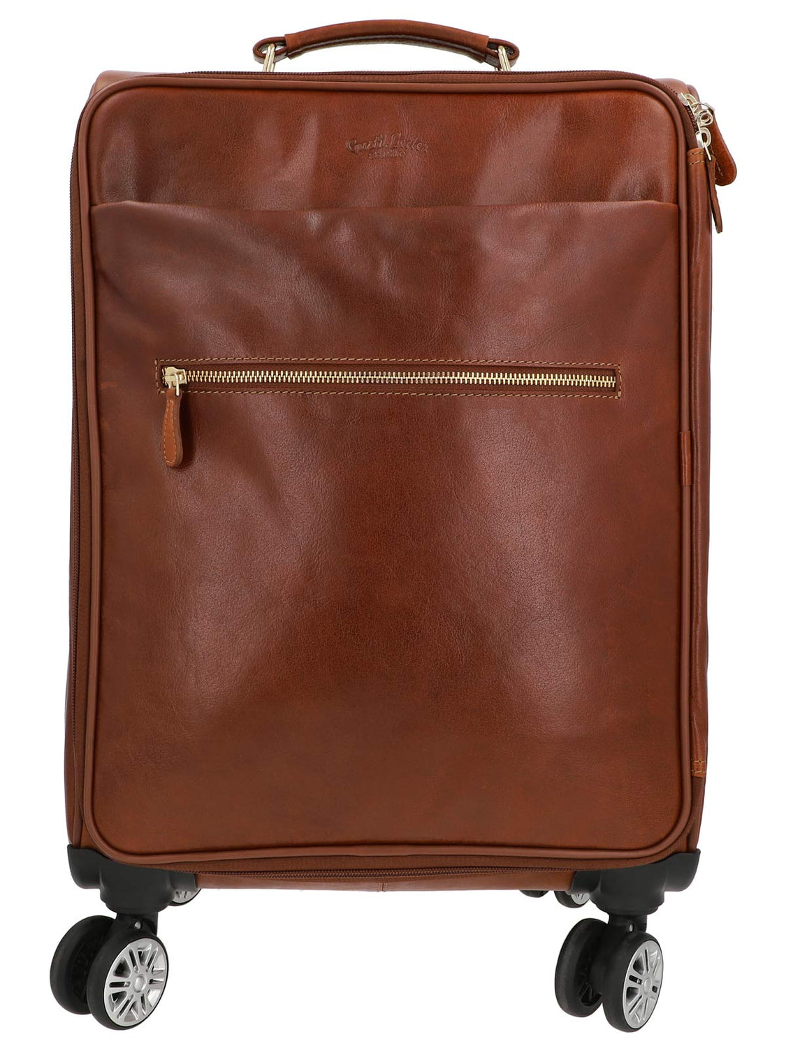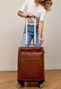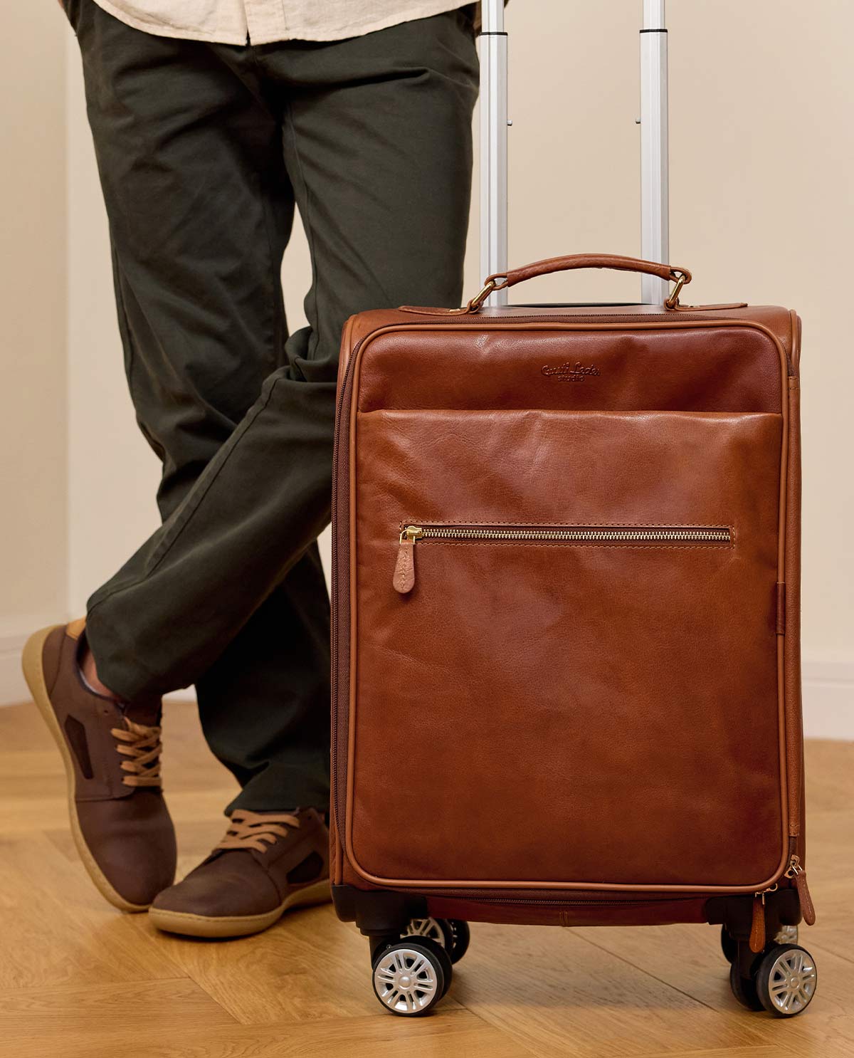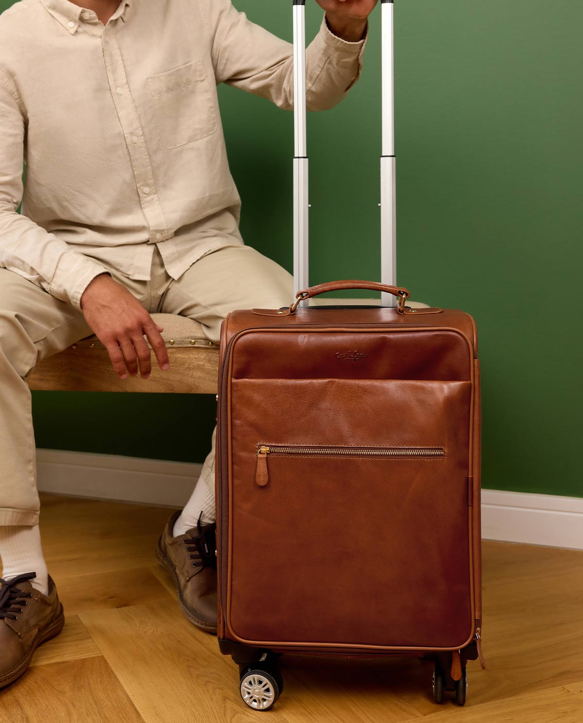 Designed for adventurous travellers to take on business trips, weekend getaways, or extended holidays, our brown leather trolley suitcase has plenty of space for your belongings and will turn heads with its subtlely chic look. It has durable wheels and an extendable handle so that it's easy to transport, even on long-haul trips.
