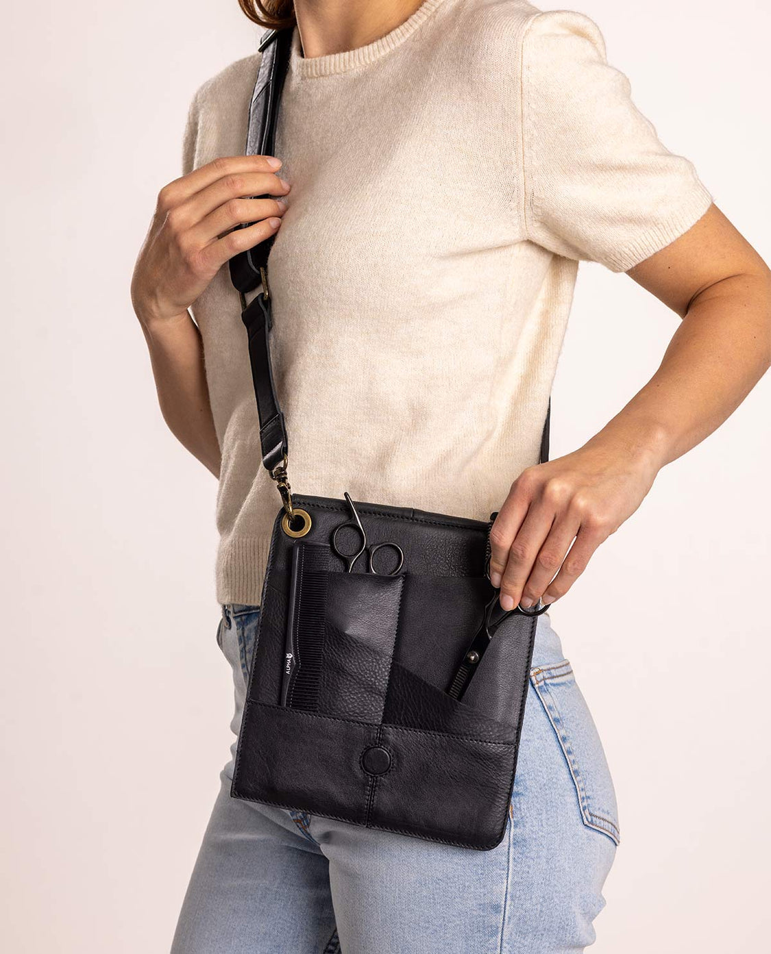 Our leather stylists bag "Moana" will impress you with her stylish design as well as her well-thought-out pocket system inside. Keep your scissors, comb, and brushes safe and organised in the series of pockets. This bag will last a lifetime and is easy to clean thanks to the timeless, sturdy, black leather. It's perfect for daily use in the salon or when you're working from your customers' homes.