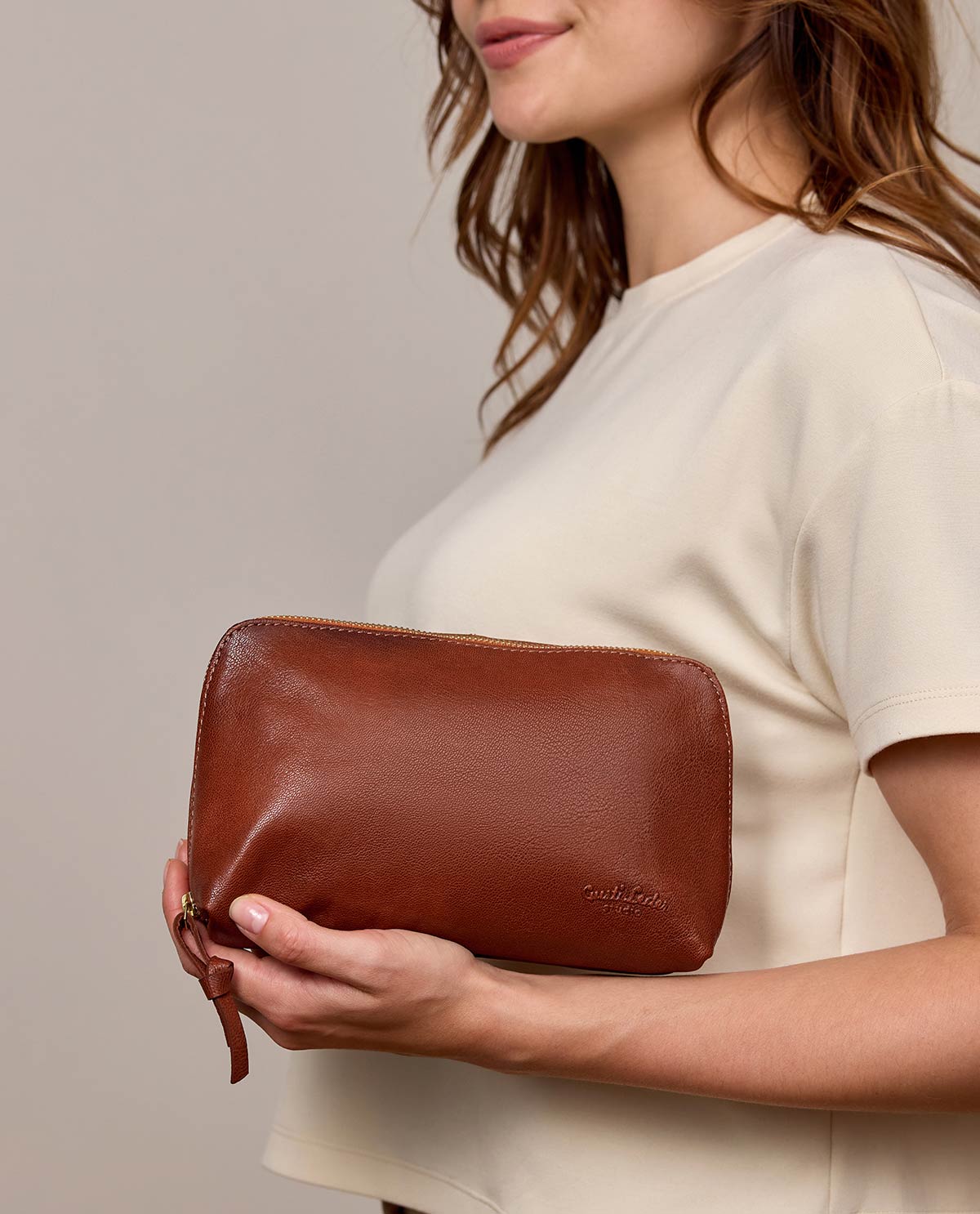 Made from high-quality, durable leather, "Eli" offers the perfect space for all your toiletries. The spacious main compartment inside offers enough space for deodorant, shampoo, conditioner, toothpaste, toothbrush, and much more. The design of "Eli" is rounded off with a matching zipper. This keeps everything together and optimally stored.