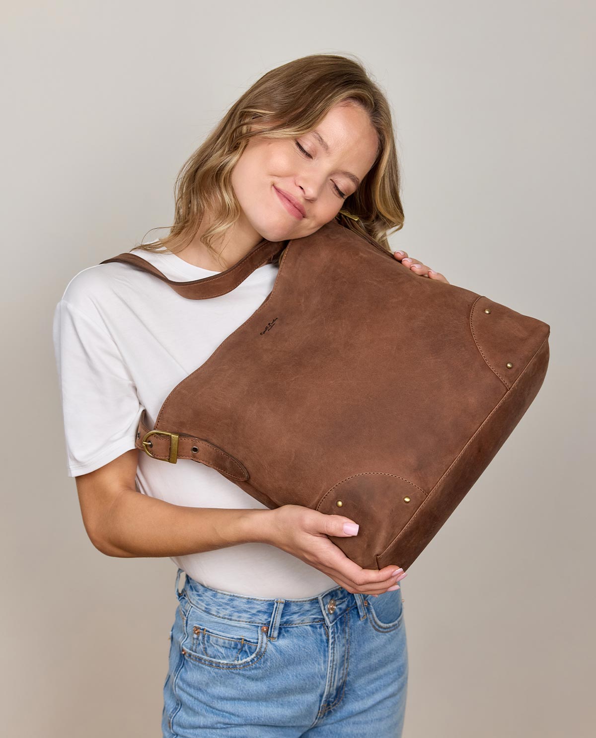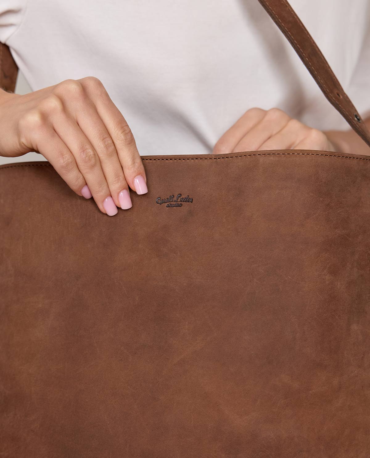 "Moje" impresses not only with its functionality but also with its high-quality details. The interior compartment additionally offers a zipper pocket for even more security and storage space. The leather patch for engraving gives the bag a personal touch, while the decorative brass rivets on the front corners add that certain something. The bag is an ideal choice for women who value both style and practical use – perfect for every day, at the office, or when traveling.