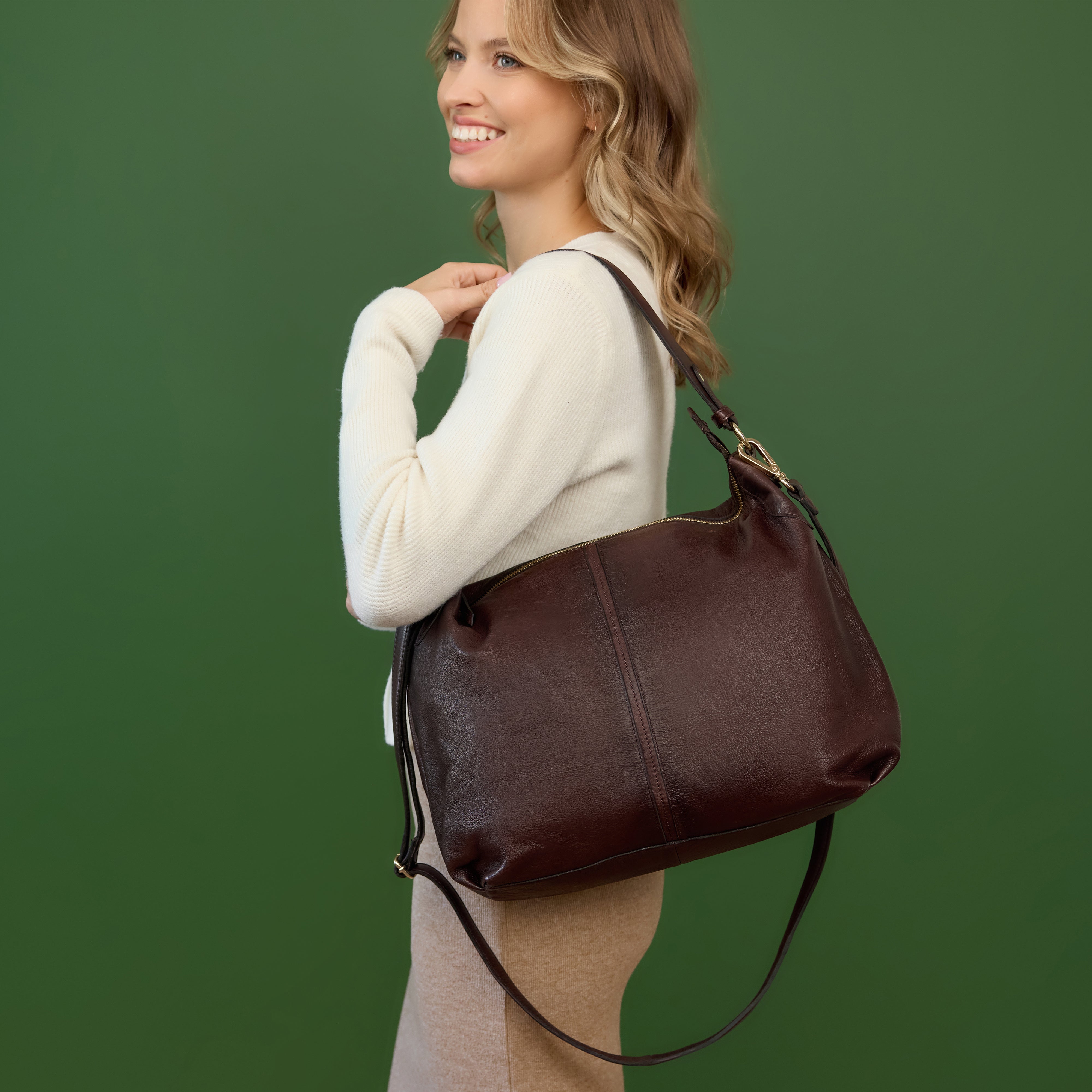 Are you looking for a classic tote bag that won’t let you down in the rain? Then “Hannah’s” exactly what you’ve been looking for! This medium-sized shoulder bag is made of sturdy cowhide leather and comes in a muted dark brown. You’ll be on-trend and still have enough space for everything you need when you’re out and about in the city or at the office, thanks to the spacious compartment inside.