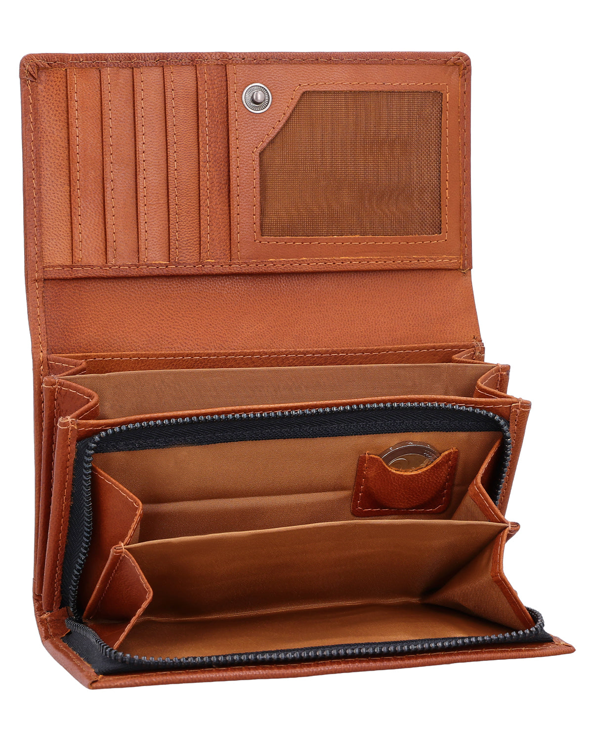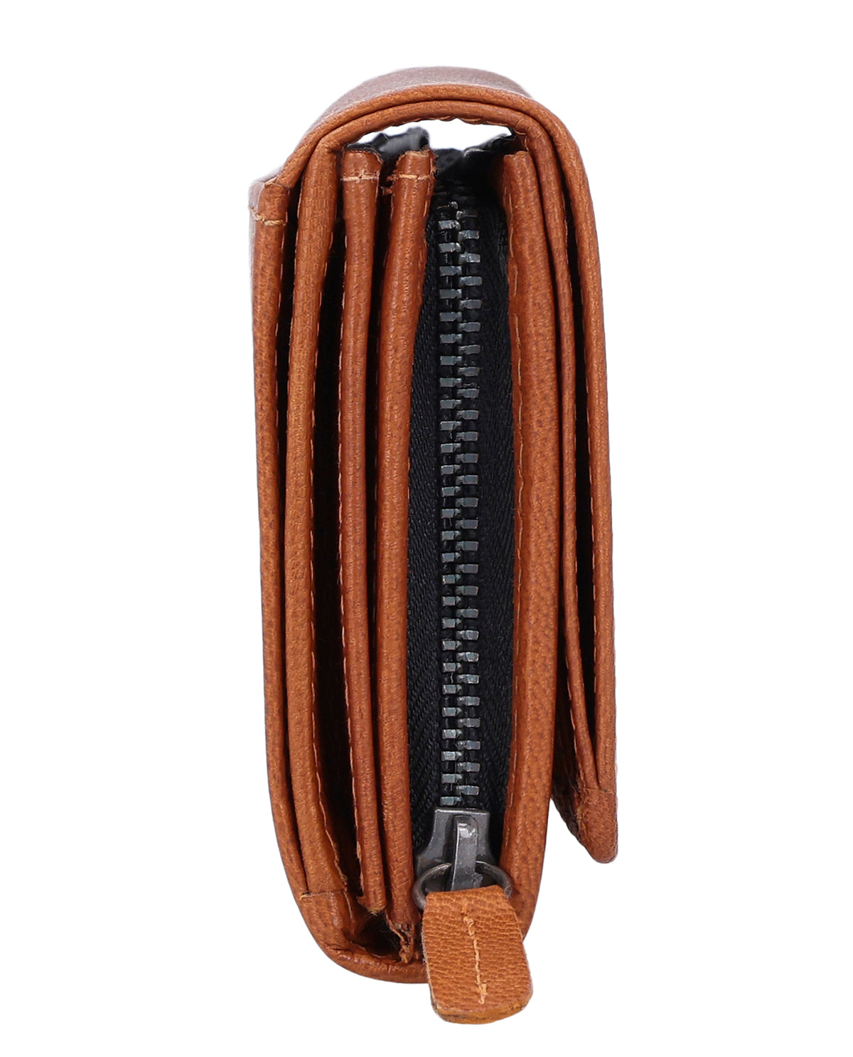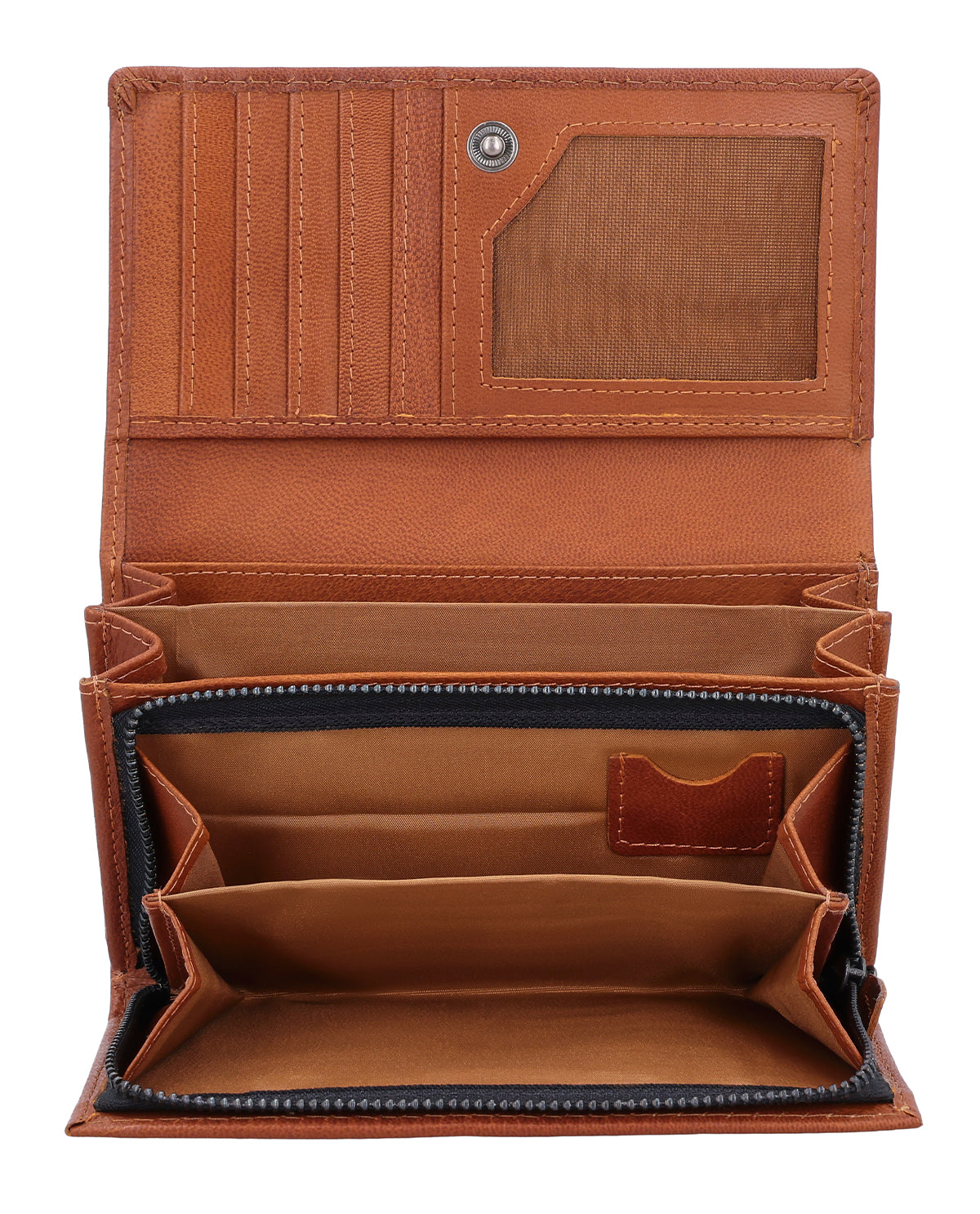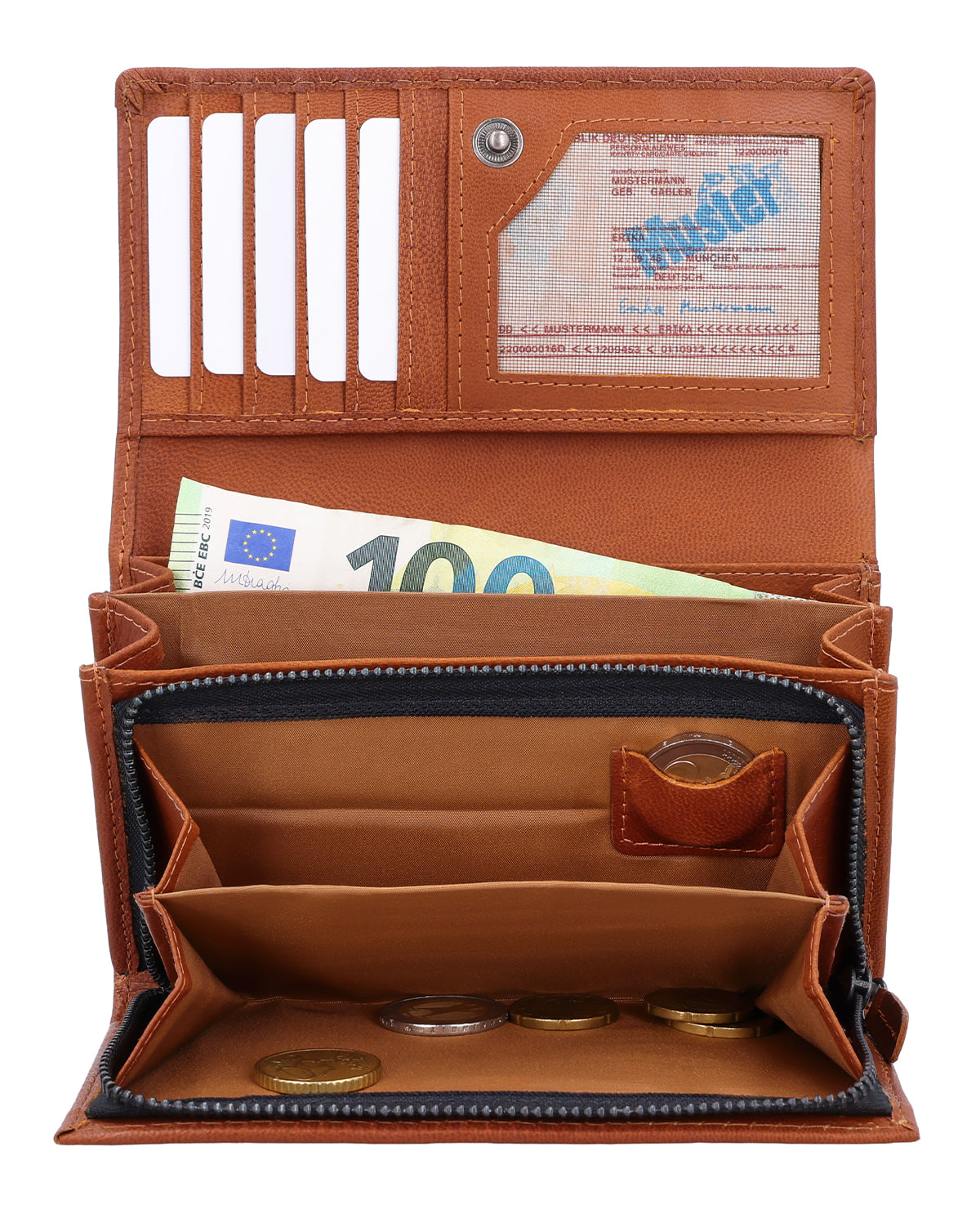 With our "Gemma" wallet, you have everything you need: cards, bills, change, and tickets all have their own place. The two coin compartments can be closed with a zipper . There is also an extra coin compartment for a single coin – ideal if you want to have a suitable coin quickly to hand. "Gemma" has space for at least five cards, and we also offer a card slot with a transparent window for your ID card, for example. Your bills are safely stored in two separate compartments. Thanks to integrated RFID protection, your cards are also reliably protected against unwanted scanning. The rest of the wallet is held together by a snap fastener. This allows you to quickly access your money, but it is still protected from falling out. The wallet is made of sturdy cowhide leather, making it a true everyday hero: perfect for frequent shoppers and those who want to become one!